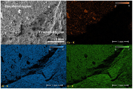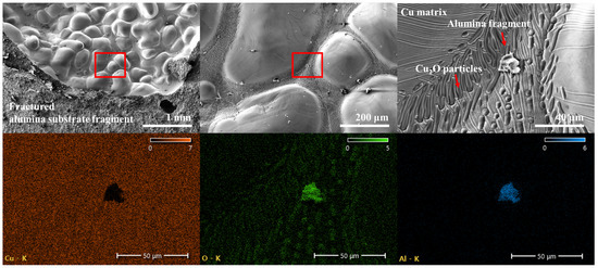 Figure 10 presents the fractured alumina surface of the 160 min specimen. The boundary between discolored and white regions was magnified for analysis. EDS confirmed the presence of Cu in the discolored region, and molten copper clusters detached during processing were observed. The opposite region, where alumina was torn off, exhibited characteristic fracture depths with no detectable Cu, confirming that it corresponded to the interior of the original alumina substrate, showing only aluminum and oxygen peaks.