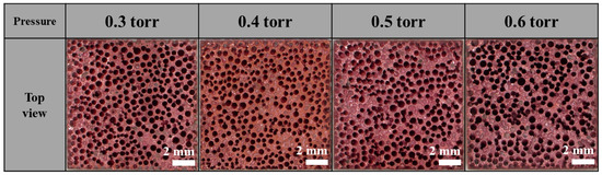 Figure 12 shows the morphological evolution of lotus-type porous copper specimens maintained for 10 min at pressures of 0.3, 0.4, 0.5, and 0.6 Torr. During the DBC process, the formation of a Cu2O oxide layer on the copper surface is critical, and this layer forms only within a limited low-oxygen range [18]. If the pressure is too high, CuO forms instead, whereas excessively low pressure reduces the oxide growth rate, preventing effective bonding. Within the tested pressure range, bonding was successfully achieved under all conditions. Minor morphological changes were observed in the copper: pores were partially filled, resulting in blocked structures. A slight increase in the number of blocked pores was noted with increasing pressure.