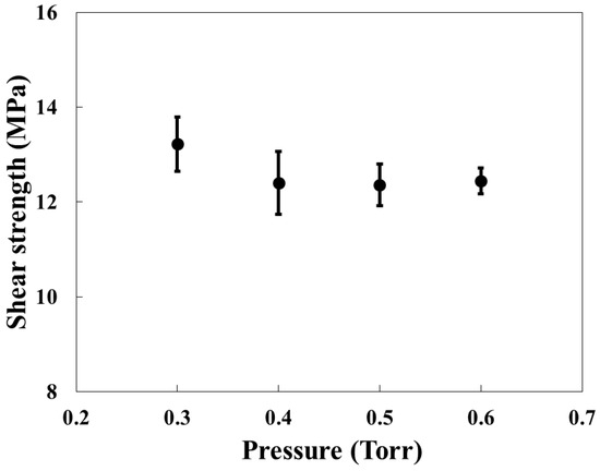 Figure 13 presents the shear strength results of specimens bonded under each pressure. Since the surface morphology exhibited minimal variation, the measured shear strengths also showed no significant differences. Therefore, within the range of 0.3–0.6 Torr, where Cu2O formation is stable, lotus-type porous copper can be reliably bonded to alumina ceramic substrates. These results indicate that bonding proceeds stably within the stable Cu2O formation range, and a minimum bonding duration of 10 min provides optimal conditions in terms of both shear strength and morphological stability.