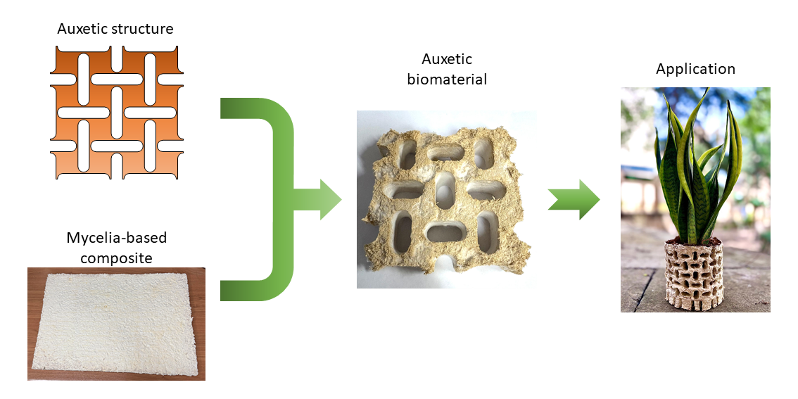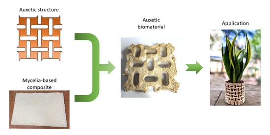 The overlap of desirable properties observable in fungi-based biomaterial and auxetics suggests that combining the two can lead to products that would be able to outperform conventional materials while at the same time being biodegradable and environmentally friendly. Essentially, the introduction of auxetic patterns in the MBCs is expected to enhance the already good acoustic and impact absorption attributes of the fungi-based biomaterial. It can also improve other aspects, such as producing lighter-weight materials compared to the original fungi-based biomaterial, given the need to introduce the voids required for the deformation. Furthermore, the end product can also lead to innovative applications, as will be discussed in this work. Notwithstanding the potential advantages in combining the auxetic and MBCs, to the knowledge of the authors, it does not seem that any investigation in this direction has been reported in the literature thus far.