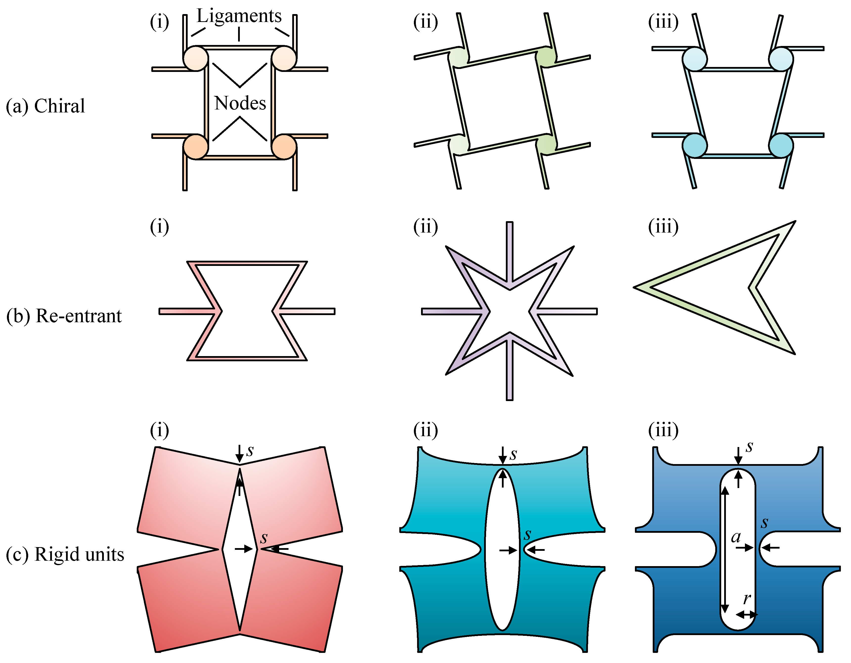 Figure 1. Examples of the three major auxetic designs: (a) showcases the chiral systems with (i) illustrating the anti-tetrachiral [52], (ii) the tetrachiral [52], and (iii) the meta-tetrachiral [64]; (b) showcases the re-entrant systems with (i) illustrating the re-entrant hexagonal honeycomb [55,65], (ii) the star-4 system [66,67], and (iii) the double arrow head [58]; (c) showcases the systems of rigid units with (i) illustrating the rotating square system having diamond shaped perforations [60,63], while (ii,iii) analogous systems obtained by using elliptical [68,69] and stadium perforations [48,70].