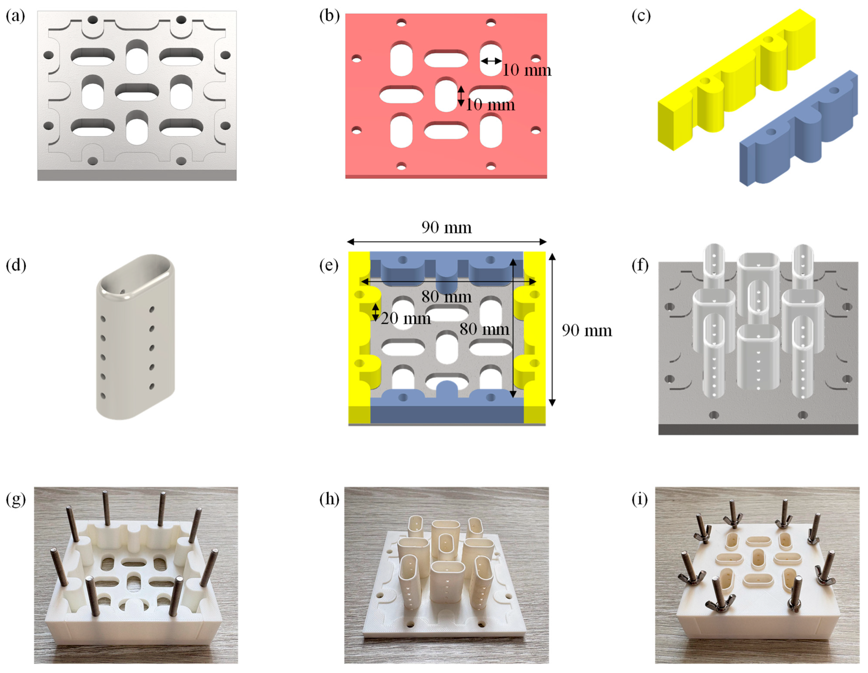 Figure 2. Components of the auxetic mold. (af) represent CAD models of the base, top, two types of sides, inserts, bottom with sides, and bottom with the inserts, respectively, while (gi) show the 3D-printed parts of the mold, illustrating, respectively, the bottom with sides and bolts, bottom with inserts, and the fully assembled mold.