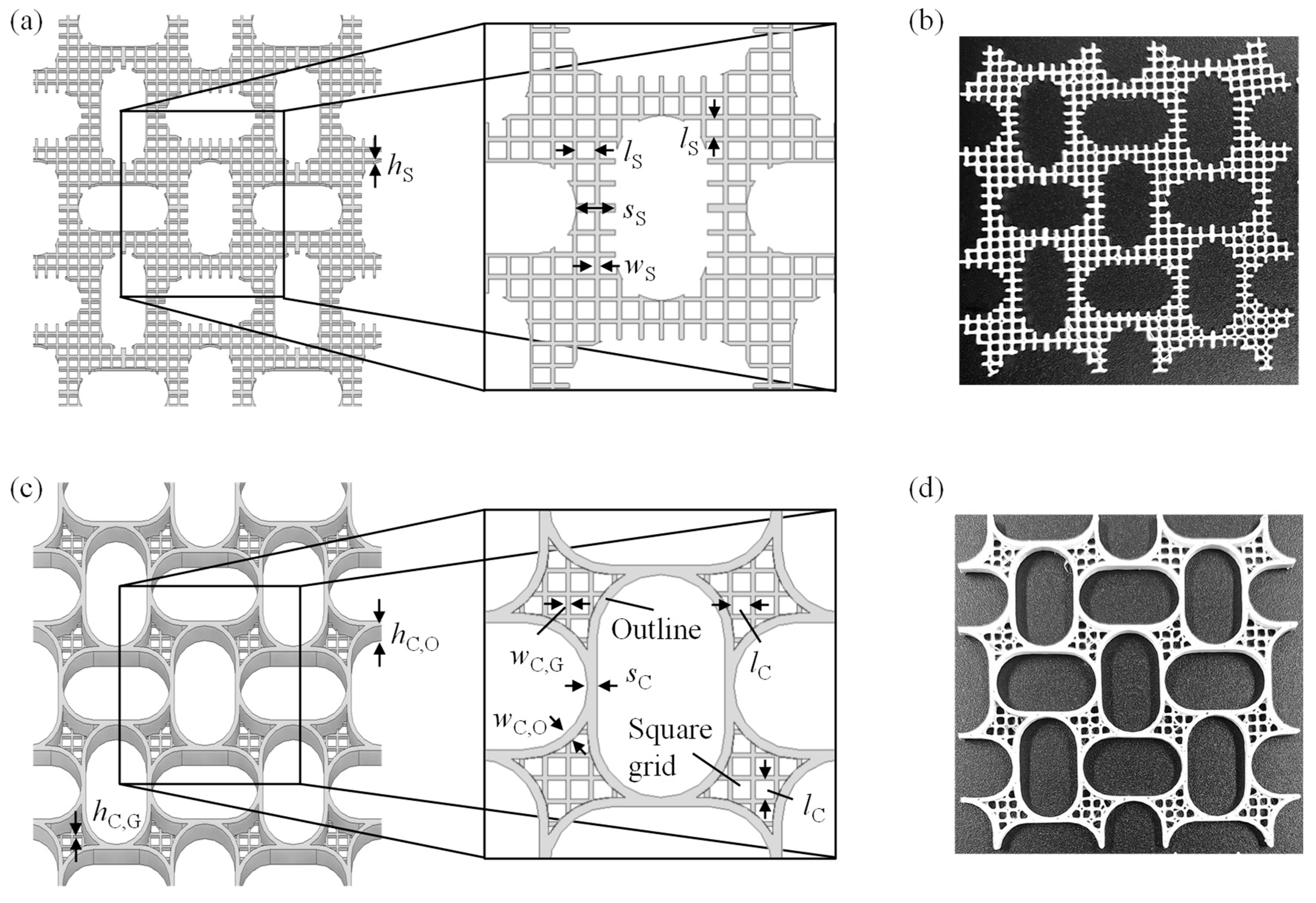Figure 4. Details of the two grid configurations: (a) presents a CAD drawing of the S-pattern with a blow up of a unit cell and the geometric parameters while (b) shows a 3D-printed version, and (c) illustrates a CAD drawing of the C-pattern with a blow up of a unit cell and the geometric parameters while (d) shows a 3D-printed version.
