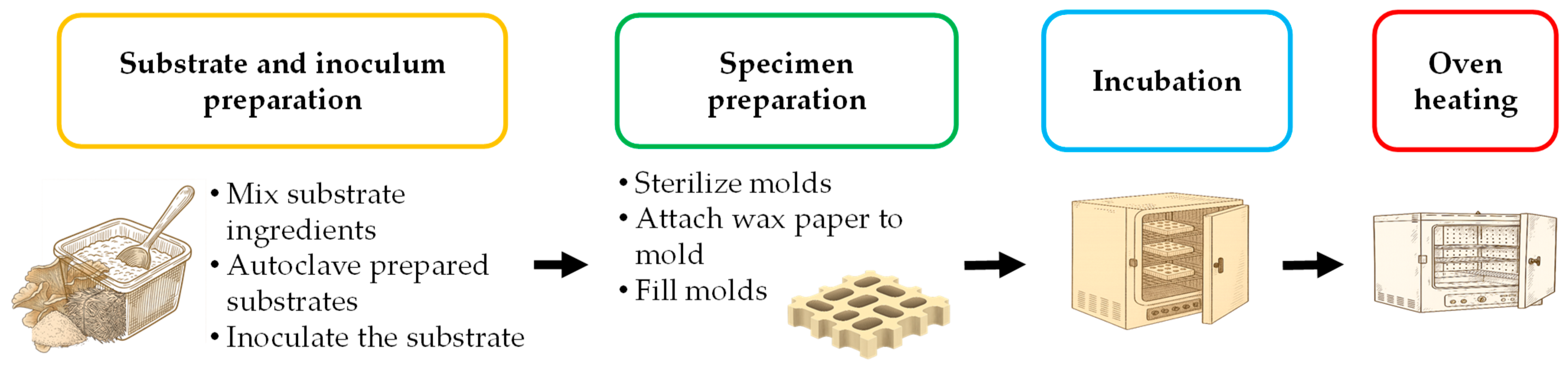 73. Elsacker, E.; Vandelook, S.; Wylick, A.V.; Ruytinx, J.; Laet, L.D.; Peeters, E. A Comprehensive Framework for the Production of Mycelium-Based Lignocellulosic Composites. Sci. Total Environ. 2020, 725, 138431. [Google Scholar] [CrossRef]
