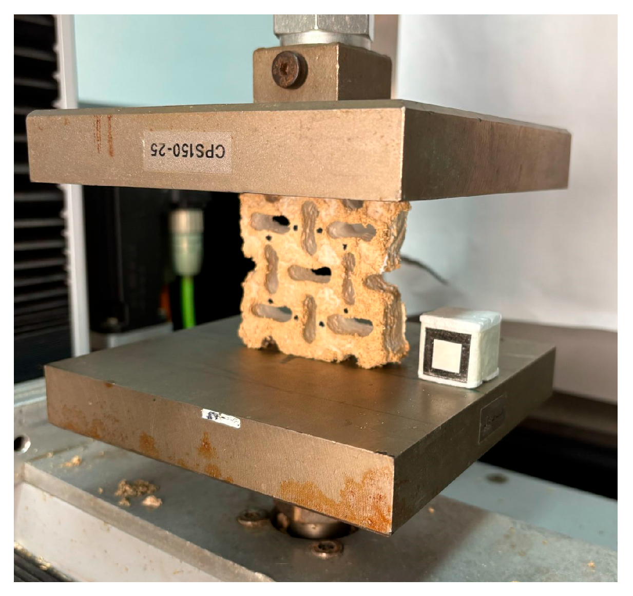 To measure the Poisson’s ratio, eight black dots were marked on the sample, delineating the central unit cell. The deformation was then recorded at a rate of 1 frame per second (FPS) with a Daheng imaging camera (MER2-630-60U3M; China) having a resolution of 3088 × 2064 px and mounted with a Get Cameras lens (LCM-5MP-08MM-F1.4-1.5-ND1; China) possessing a focal length of 8 mm. The camera and lenses were stably fixed and leveled horizontally in front of the sample. Subsequently, the axial and transverse measurements of the distance between the dots were calculated using an in-house pattern recognition Python script, having an in-built calibration procedure. For this purpose, a reference object of known dimensions was placed close to the specimen during the testing to serve as a reference scale for length measurements. It consisted of a white square on a black background (Figure 6).