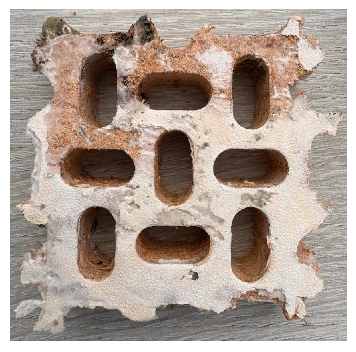 In general, the samples produced using the in-house mixes were rather compact at the end of the fabrication process (Figure 7). However, this appeared to have significantly reduced the substrate’s ability to retain moisture. In fact, after four weeks of incubation, the material appeared overly dry and had poor adhesion. It was for this reason that additional hydration and extension of the growth period were undertaken. This had the effect of improving the cohesion of the end product.