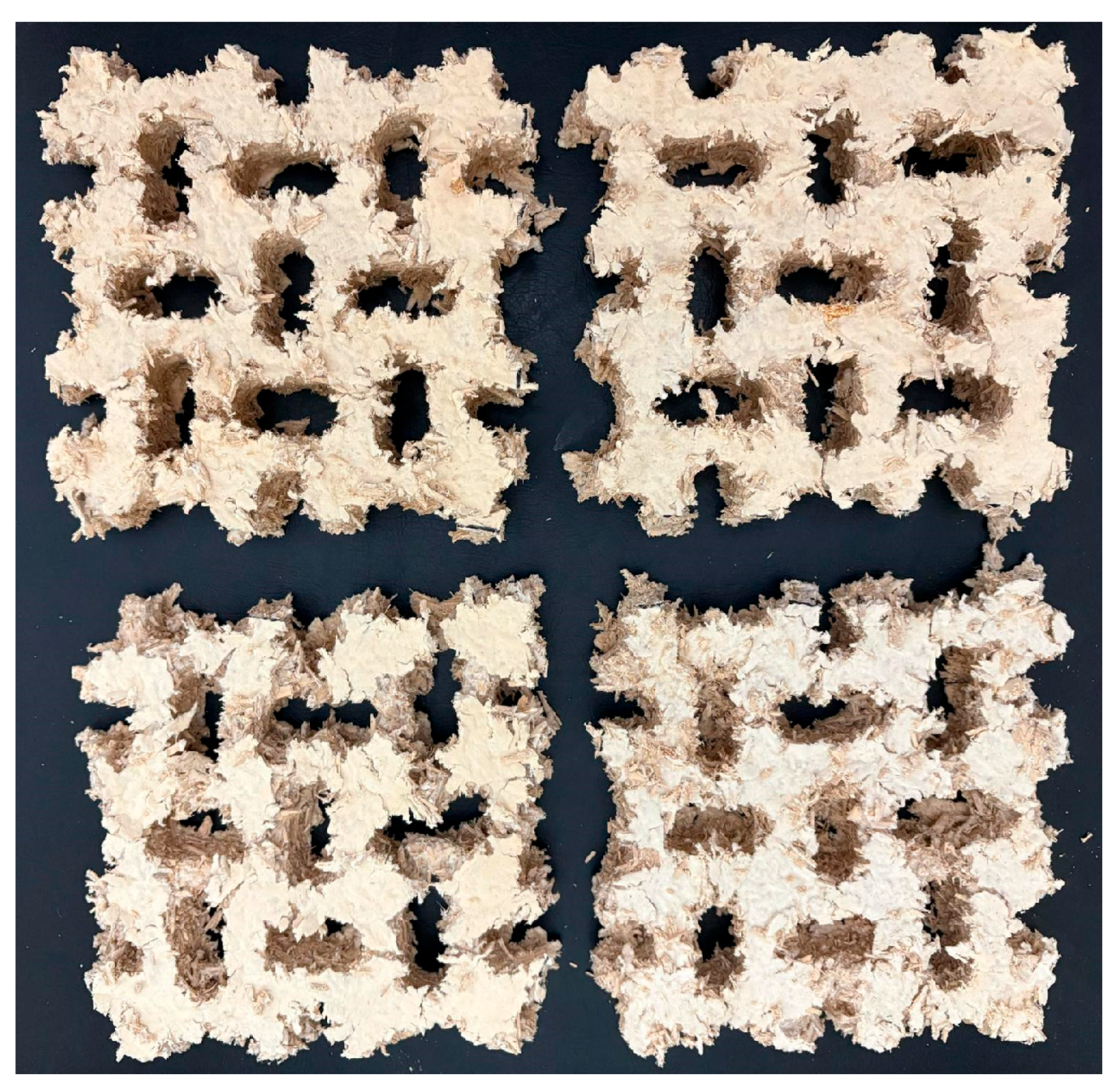 • Inclusion of C-pattern: Only two grids were placed in the mold, positioned between 10 g layers of the inoculated substrate, as the C-pattern scaffolding was thicker than the S-pattern one.