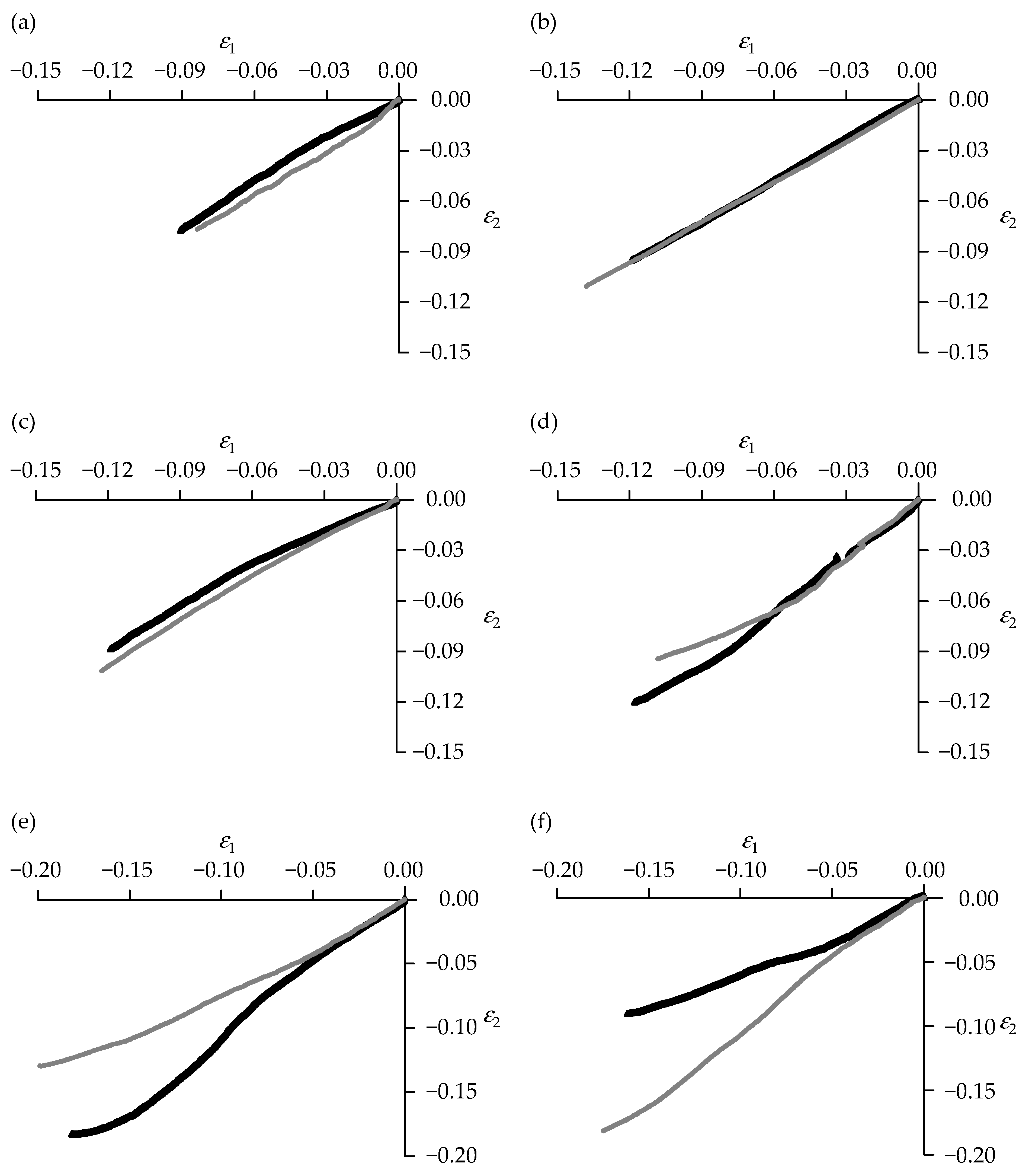 Figure 9. The transverse to axial strain variation of the two sets of results (shown in gray and black) obtained for samples grown using the in-house mix, with (a) presenting those for A1, (b) A2, (c) C1, (d) D1, (e) D2, and (f) G2.