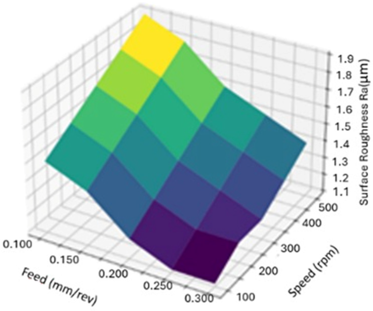 - A surface roughness reduction of 0.9 µm is achieved by increasing the speed to 200 rpm, f at 0.1 mm/rev, and making two passes.