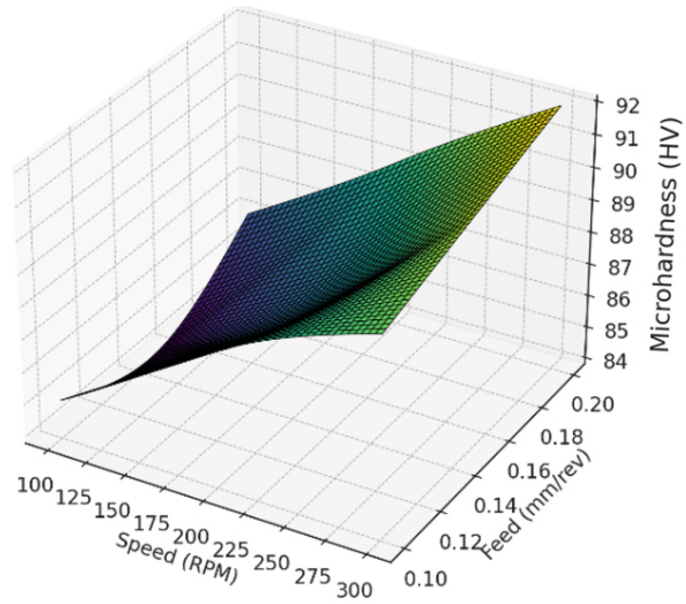 - A microhardness of 88 HV is achieved by increasing the speed to 200 rpm and making two passes at an f of 0.1 mm/rev.