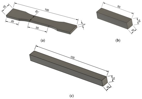 The CAD models of the test specimens were designed using the Autodesk Fusion software, version 2.0.20948. Their dimensions were determined considering the standards for tensile test (ASTM D638 []), three-point bending test (ASTM D790 []), and impact test Izod (ISO 180 []), as illustrated in Figure 1.