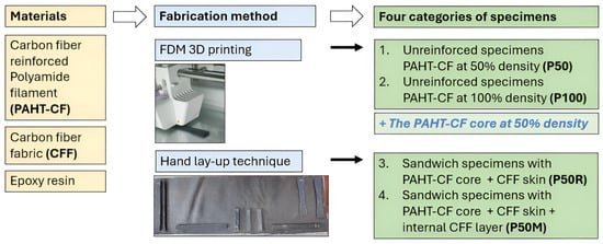 For each mechanical test, four categories of specimens were investigated, as shown in Figure 2. The first two categories refer to the unreinforced 3D-printed specimens, while the third and fourth category refers to sandwich specimens with 3D-printed core and CFF reinforcement. A code has been assigned to each category for convenience.
