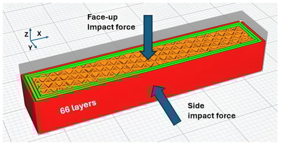 When the impact force is applied perpendicularly to the side surface (i.e., vertically to the deposition of the 66 layers), it appears that the adhesion between successive layers is not particularly affected by the infill pattern, and, therefore, no change in impact resistance is observed. In this case, the bonding between successive layers may depend more on printing parameters—layer height, nozzle temperature, and print speed—than on the infill pattern.