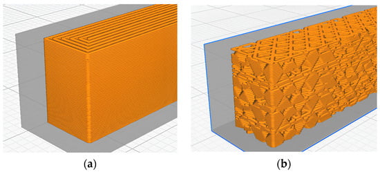 A less complicated procedure to create 3D-printed cellular cores, which eliminates the extensive design and modelling process, is the determination of the infill pattern of the core structure directly in the 3D printing slicing software. Through this procedure, infill patterns can be generated as two-dimensional (e.g., lines or rectilinear, triangles or triangular, zig zag, concentric, tri-hexagonal), or as a network of three-dimensional unit cells (e.g., cubic, gyroid, cubic subdivision, cross 3D, octet, 3D honeycomb) [,,].