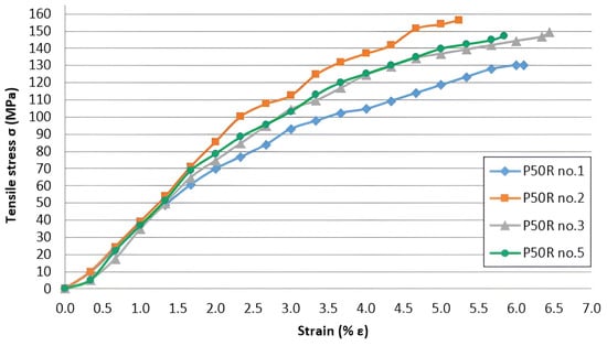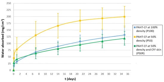 Water absorption was determined according to the standard ASTM D570 [] for three different samples for each of the categories P100, P50, and P50R. The typical curves of water absorption expressed as mg H2O per 100 mg are shown in Figure 7. In addition, the average values of water absorbed by the specimens in a 35-day immersion period in distilled water are reported in Table 5.