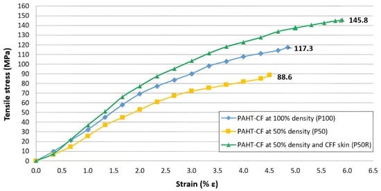 Figure 3 shows the tensile stress–strain curves obtained for the 3D-printed PAHT-CF specimens at 100% infill density. Two specimens were 3D printed for each pattern combination and tested until failure. For all specimens, the fracture occurred along the length of the gauge.