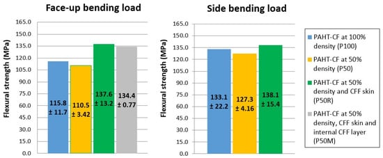 Regarding the sandwich specimens with a 3D-printed core and CFF skin (P50R), they exhibited a slight increase in density compared to the P50 specimens. This increase is mainly attributed to the higher density of CFF/epoxy resin, which replaced the corresponding volume of PAHT-CF in the P50R specimens, compared to the density of the 50% infilled PAHT-CF material. It is also interesting that the density of the P50R sandwich specimens was found to be even lower than that of the solid P100 specimens. This is a particularly important finding, showing that this specific choice of materials and fabrication technique can provide structures with reduced weight.
