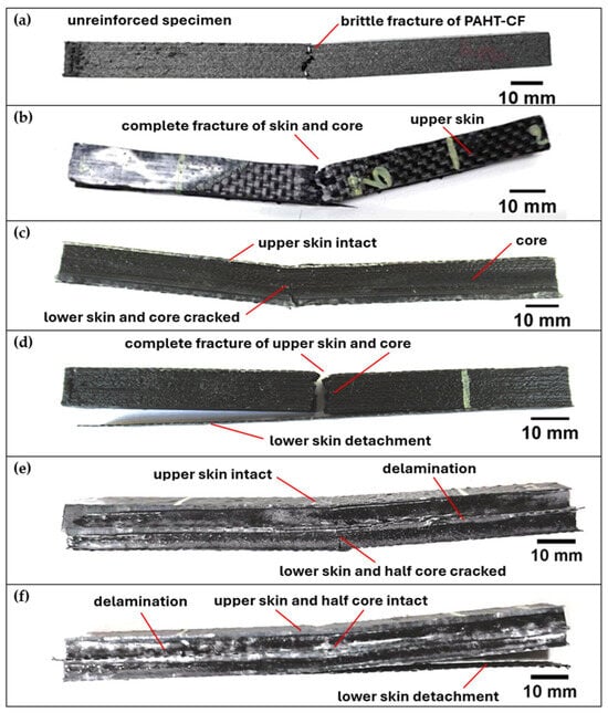The hand lay-up technique for all sandwich specimens was performed at a constant room temperature of 20 °C and a relative humidity of 50%. Prior to joining, the surfaces of the 3D-printed core were ground with sandpaper #220 to create roughness on the surface and promote adhesion. After fabrication, all sandwich specimens were fixed using clamps, left for seven days under the same environmental conditions to achieve slow curing, and then machined with simple tools to obtain their final shape. Images from the FDM 3D printing process and the hand lay-up technique are provided in Figures S1 and S2 in the Supplementary Material.