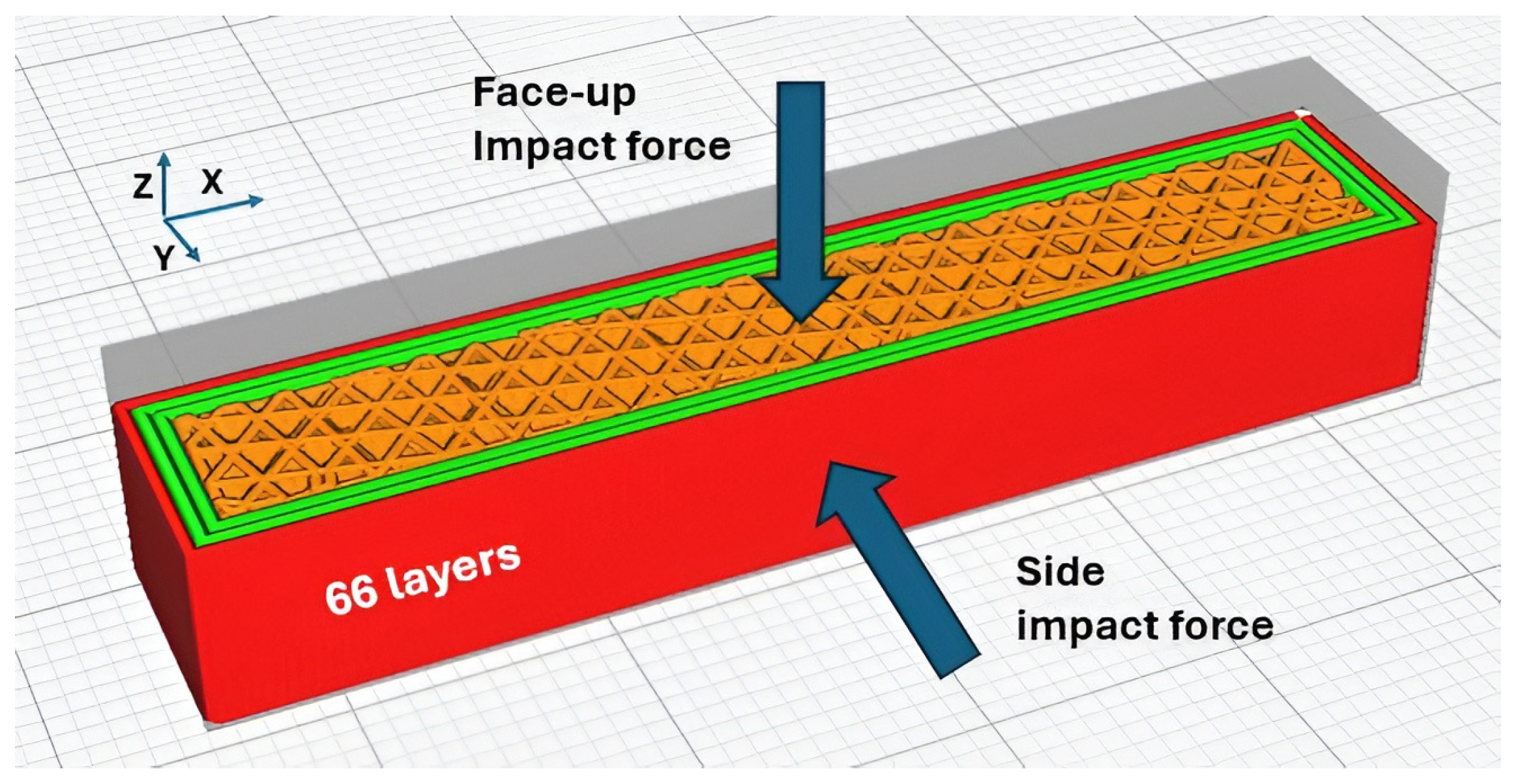 | [63], 2023 | honeycomb with altering layers at 30% and 100% infill density | PP | CFRP | low-velocity impact test |