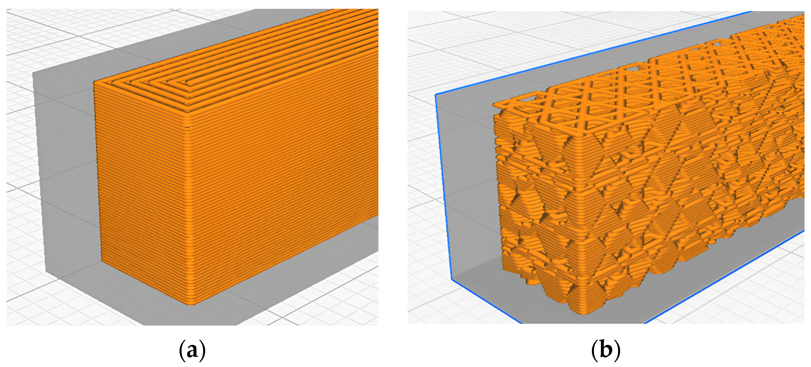 - Wickstrom, S. Mastering 3D Printing Infill Patterns: From Gyroid to Lightning. Available online: https://ultimaker.com/learn/mastering-3d-printing-infill-patterns-from-gyroid-to-lightning/ (accessed on 17 July 2025).