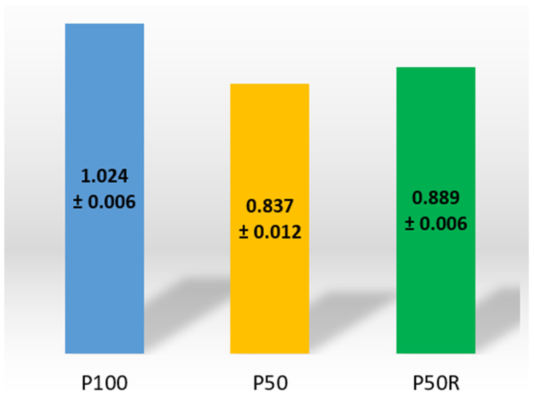 | P100OO | 100.18 ± 0.06 | 10.23 ± 0.04 | 3.06 ± 0.01 |