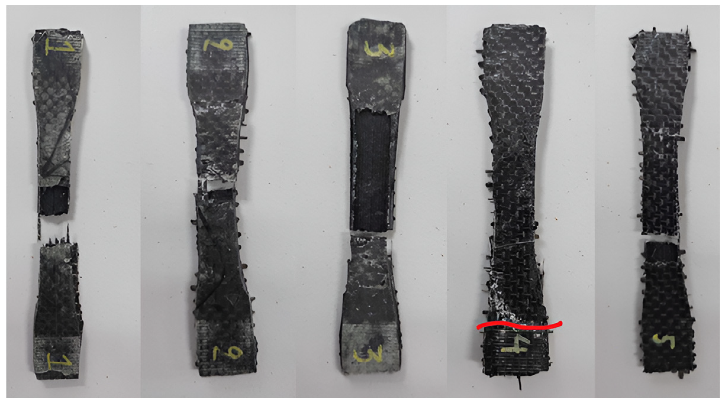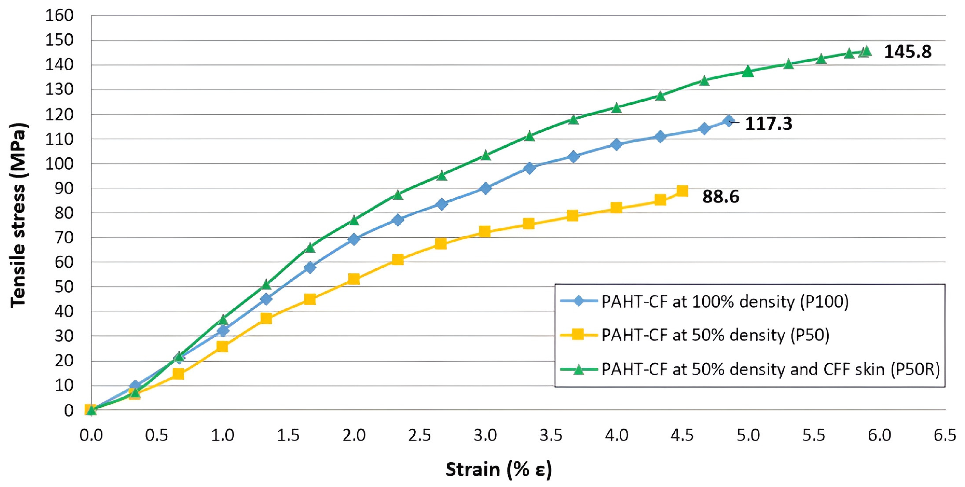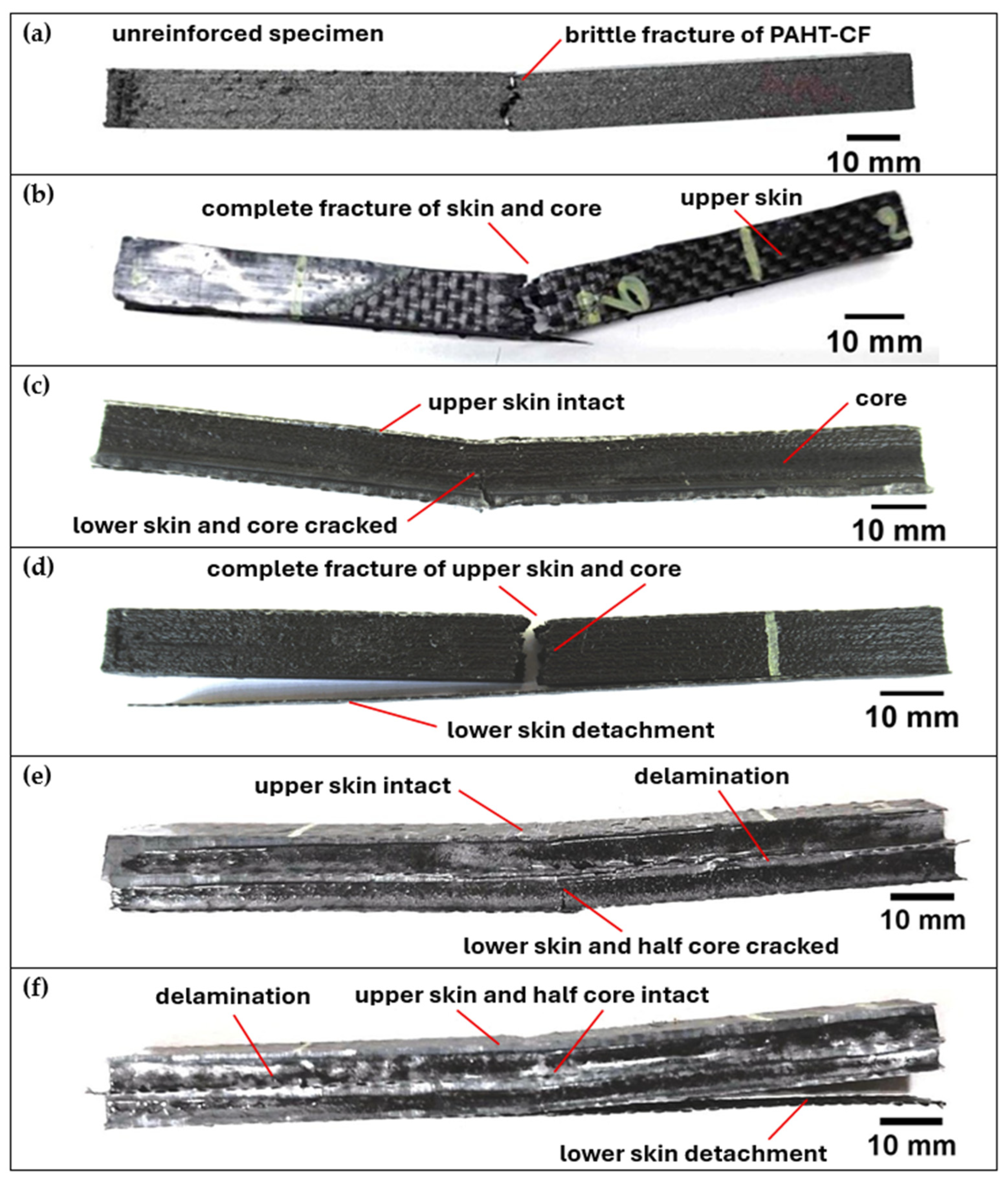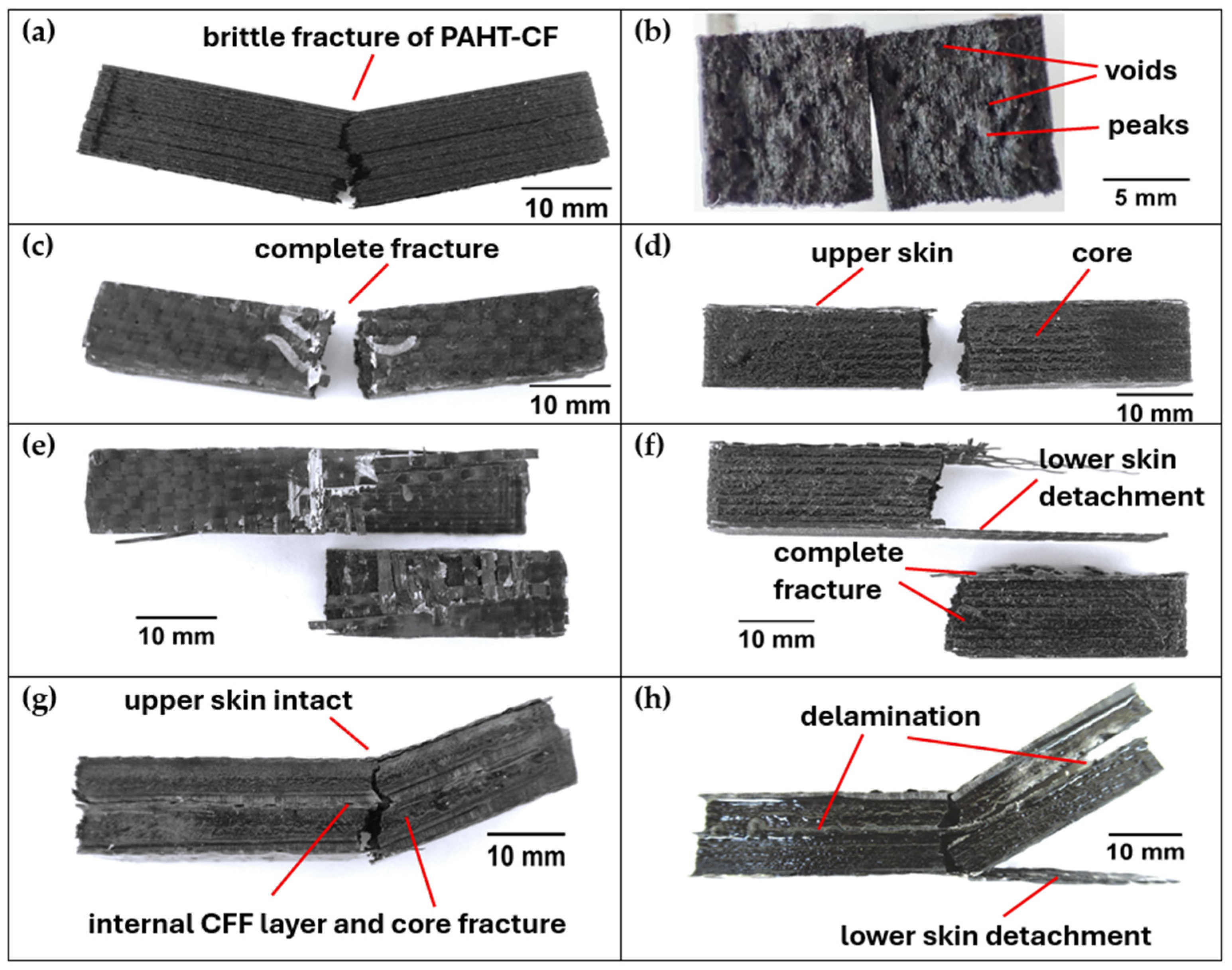 - The PAHT-CF core material enhanced the overall tensile strength and stiffness of the sandwich structure. This improvement is attributed to the high strength chopped carbon fibers embedded in the polyamide matrix, oriented along the deposition beads, that increase resistance to crack propagation and reduce the likelihood of failure.