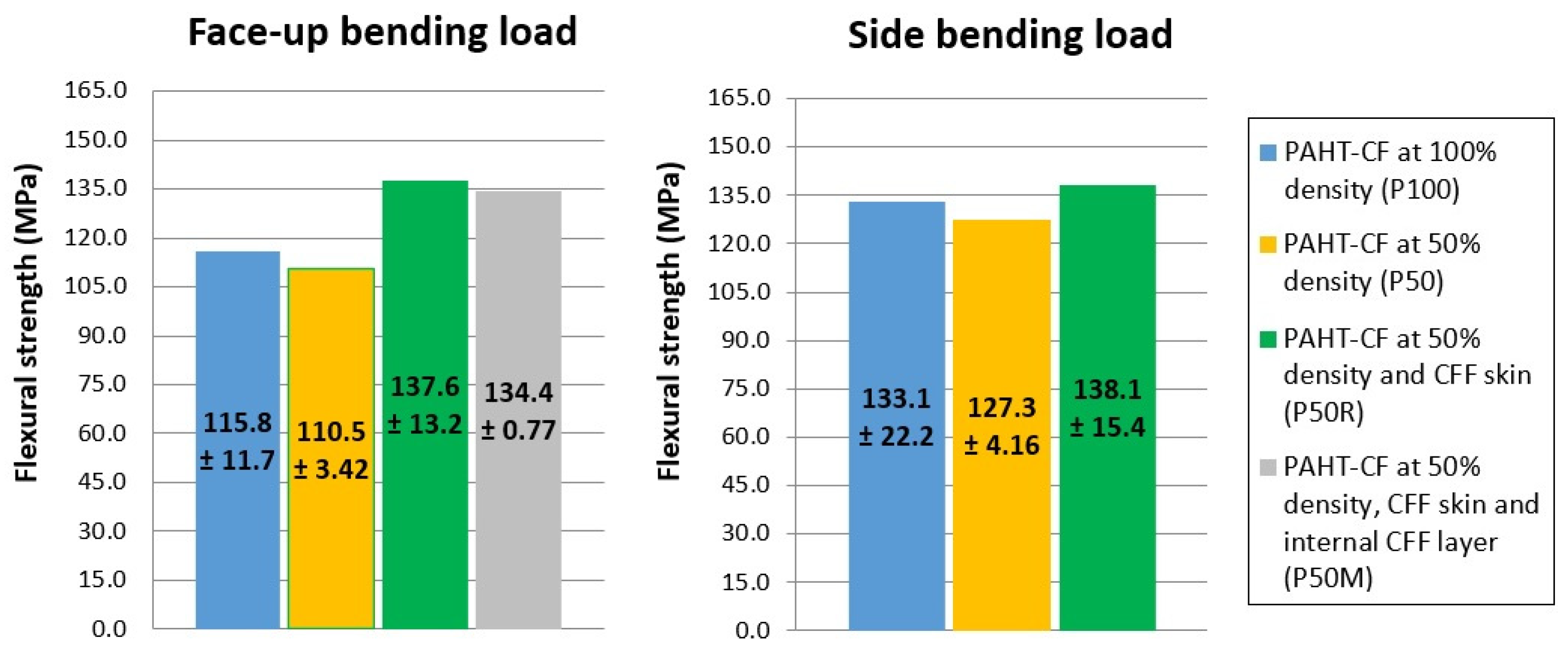 | [18], 2022 | PAHT-CF | grid, lines, triangles | 0.2 mm layer height; 50% infill density | bending and tensile strength | Tensile strength was found higher for the lines pattern followed by triangles and grid. Bending strength was found higher for triangles followed by lines and grid. Defects decreased from grid pattern to lines pattern while they were insignificant for the triangles pattern. |