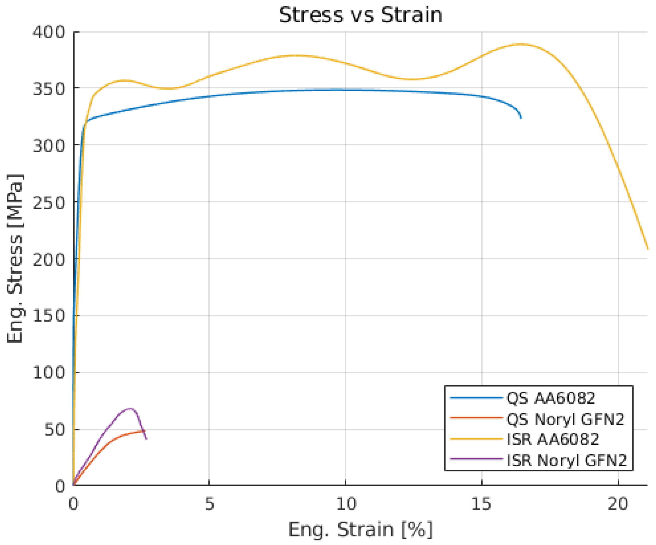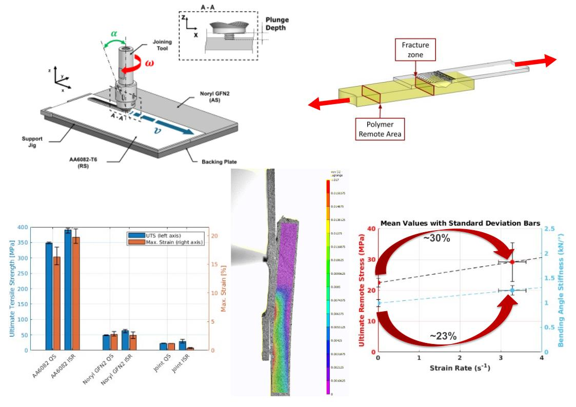 - Dissimilar polymer—aluminum friction stir lap joints have a positive strength strain rate sensitivity. This increase in strength is accompanied by an increase in joint stiffness and decrease in ductility. The average remote stress increased by ≈30% and stiffness ≈23%;