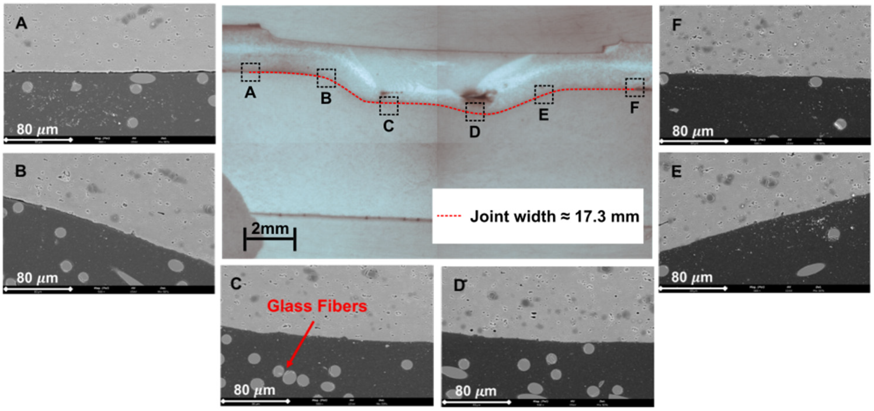 - Failure remains polymer-controlled at both rates, occurring in the Noryl™ adhered near the processed zone edge; higher rates shift the load mix toward more shear/less peel, consistent with reduced out-of-plane rotation and a more brittle polymer response; the nonplanar bending of the joints differed from quasi-static to intermediate strain rate. A higher bending angle stiffness was found for higher strain rates, requiring higher values of joint load or joint displacement to achieve similar values of out-of-plane bending angle;