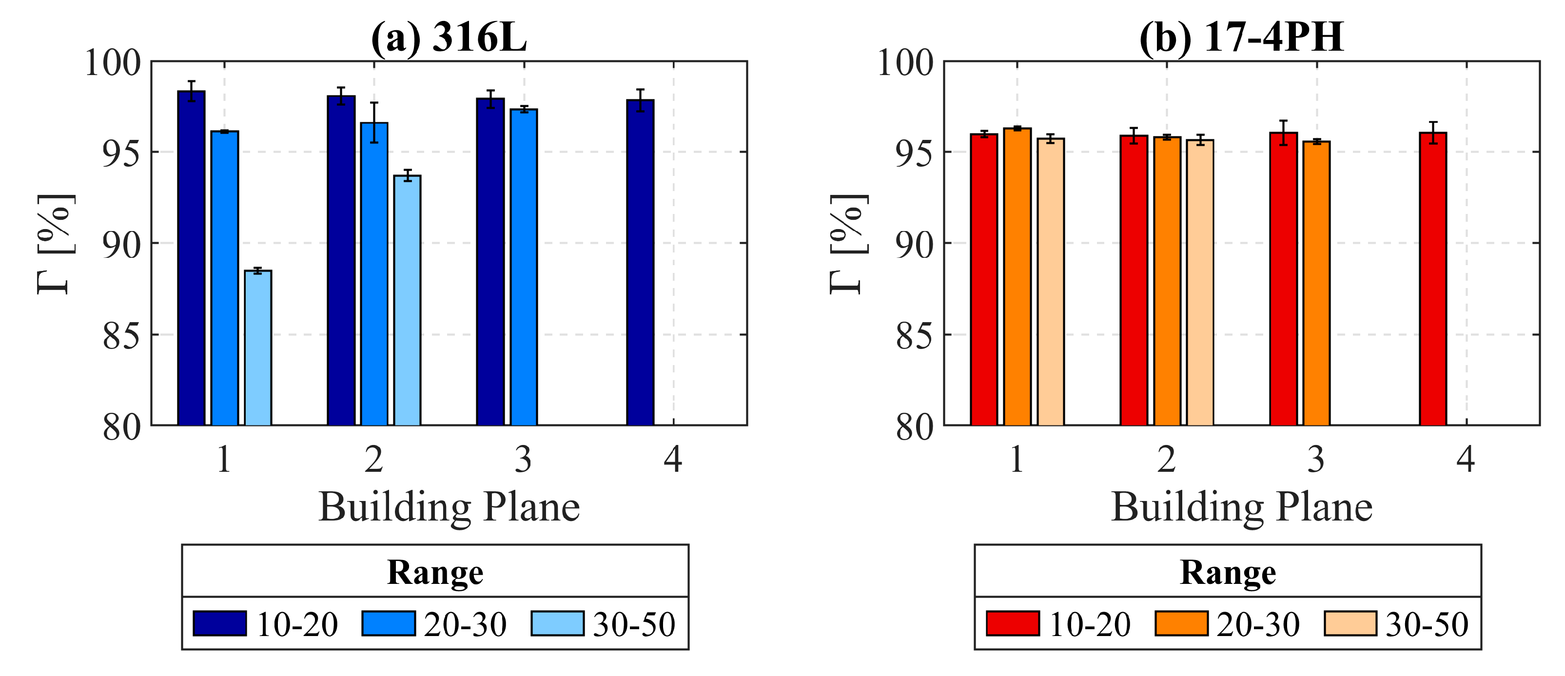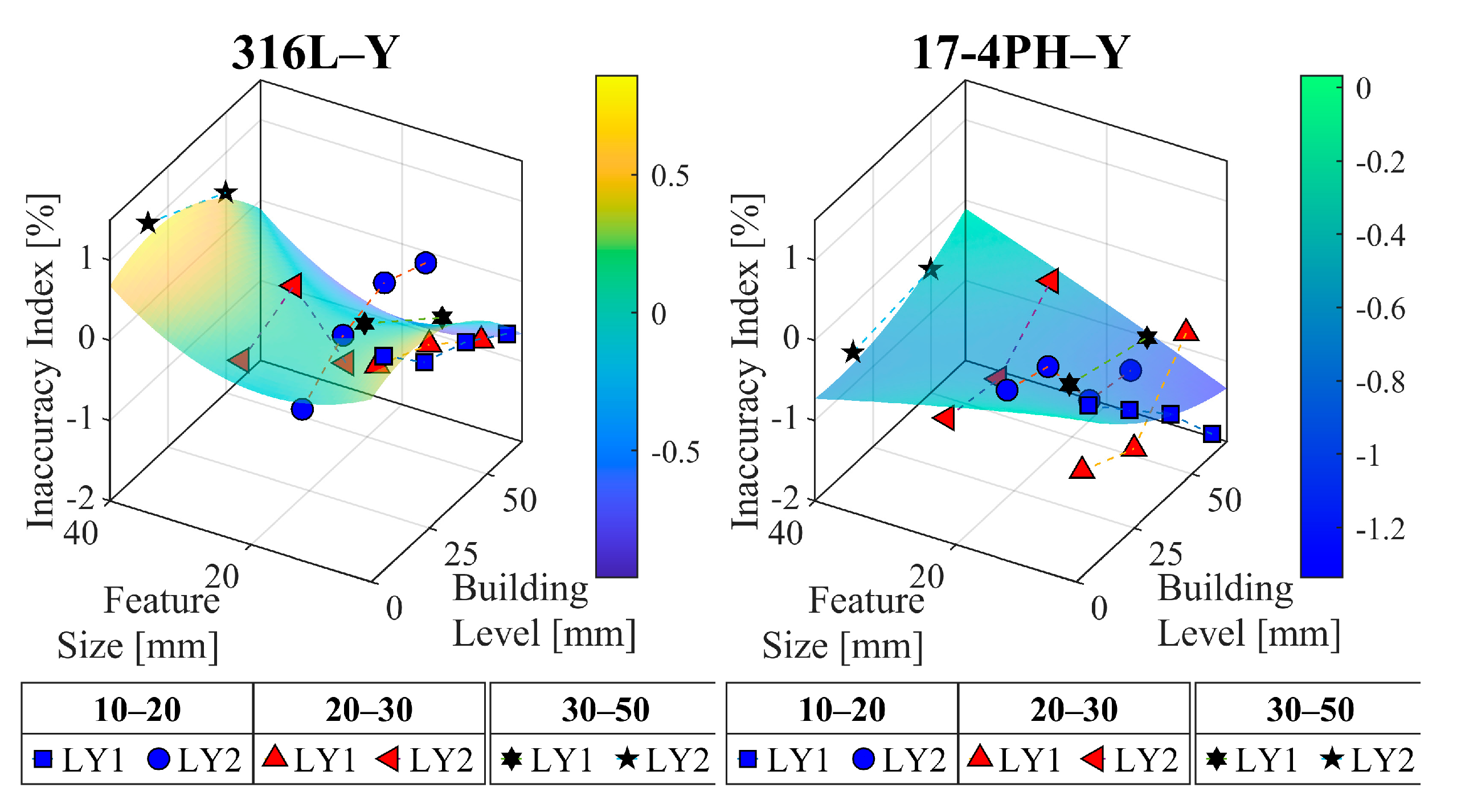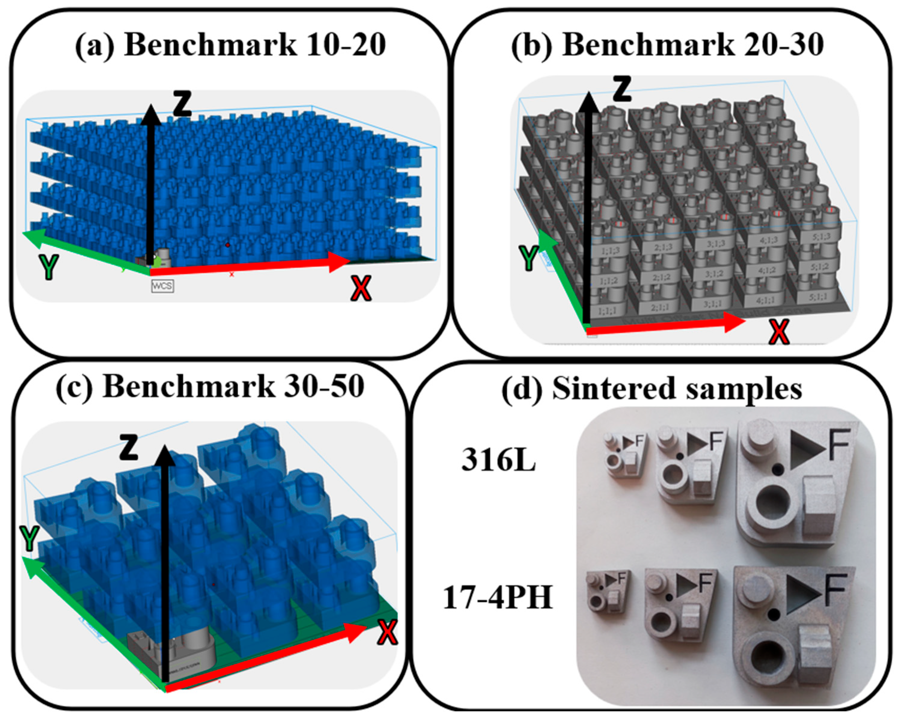 - Zago, M.; Lecis, N.; Mariani, M.; Cristofolini, I. Analysis of the causes determining dimensional and geometrical errors in 316L and 17-4PH stainless steel parts fabricated by metal binder jetting. Int. J. Adv. Manuf. Technol. 2024, 132, 835–851. [Google Scholar] [CrossRef]