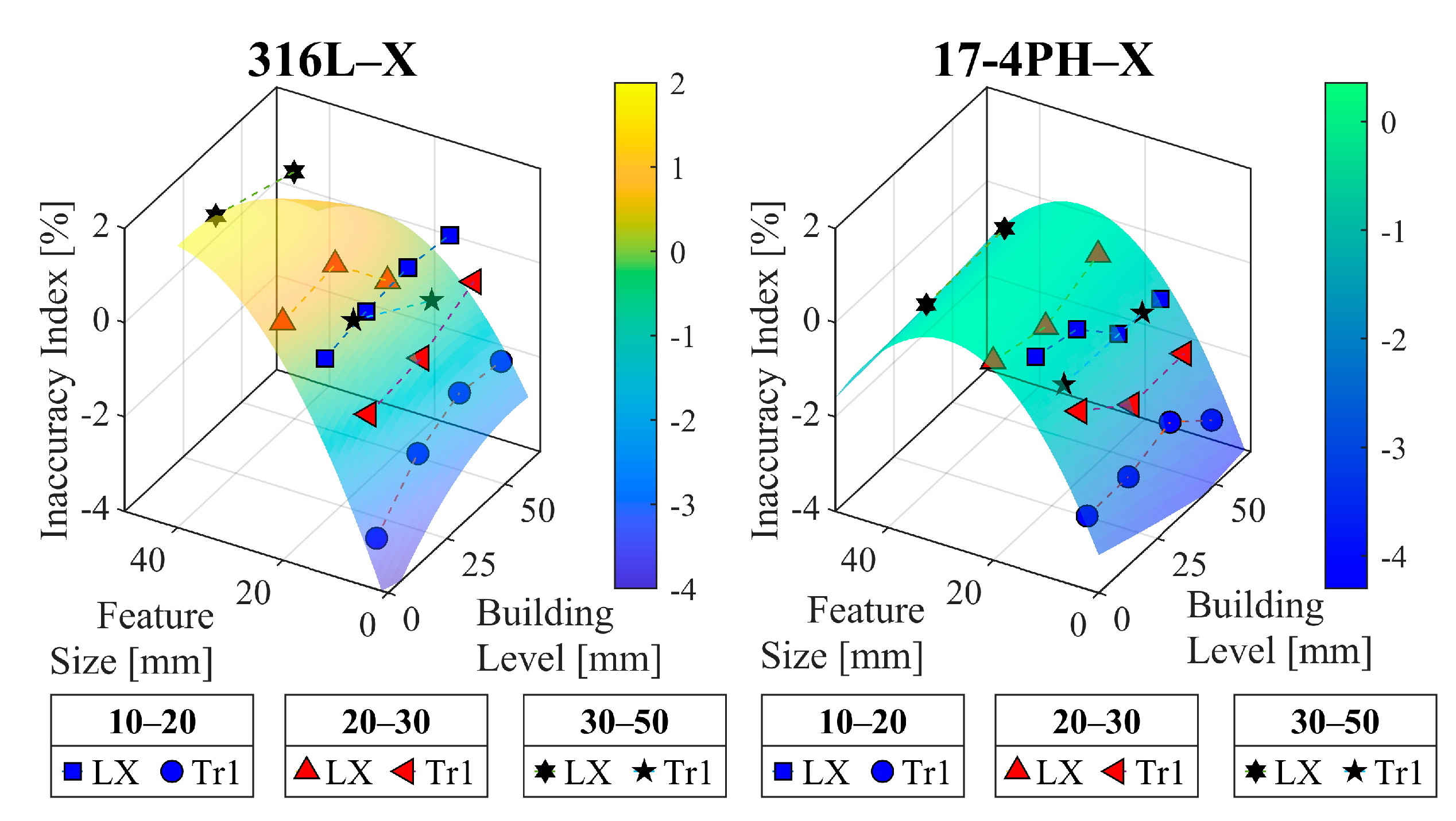 - In the green state, the inaccuracy index varied between −0.5% and 1%. It tends to decrease with feature size, and spatial repeatability is not constant but depends on the building plane. The loss of accuracy was attributed to the particle–binder interaction. Binder saturation and drying operations should be optimized, mainly when printing a large number of samples. Other sources of inaccuracy can be ascribed to gravitational and compaction forces acting on the powder bed.