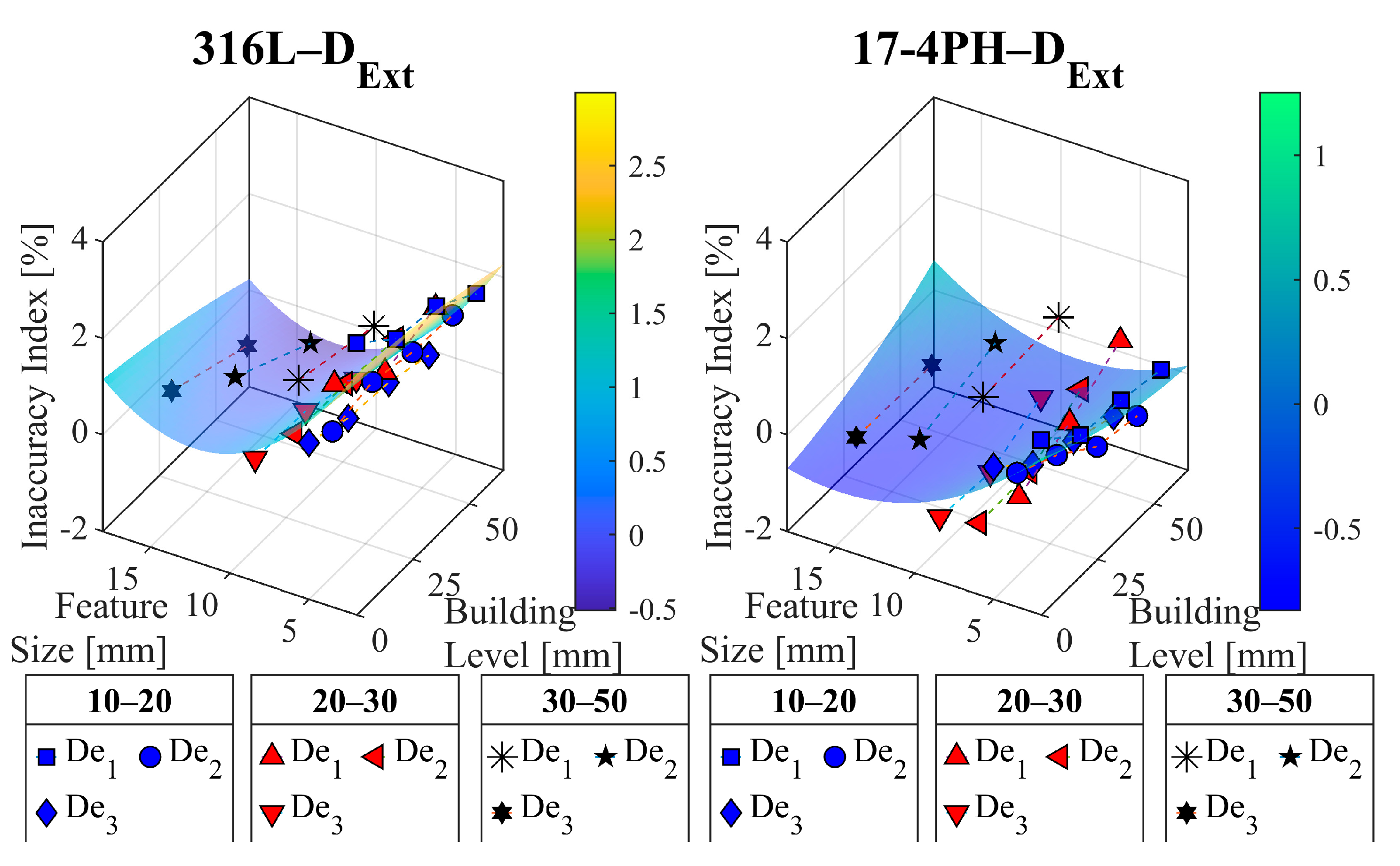 - In the sintered state, the accuracy is significantly affected by the printing direction feature size, and slightly by the building level. Small features showed a high negative deviation from nominal values, likely due to shrinkage affected by the feature size, according to the density and microstructure analysis. Small features reached a higher density and, consequently, a higher dimensional change.