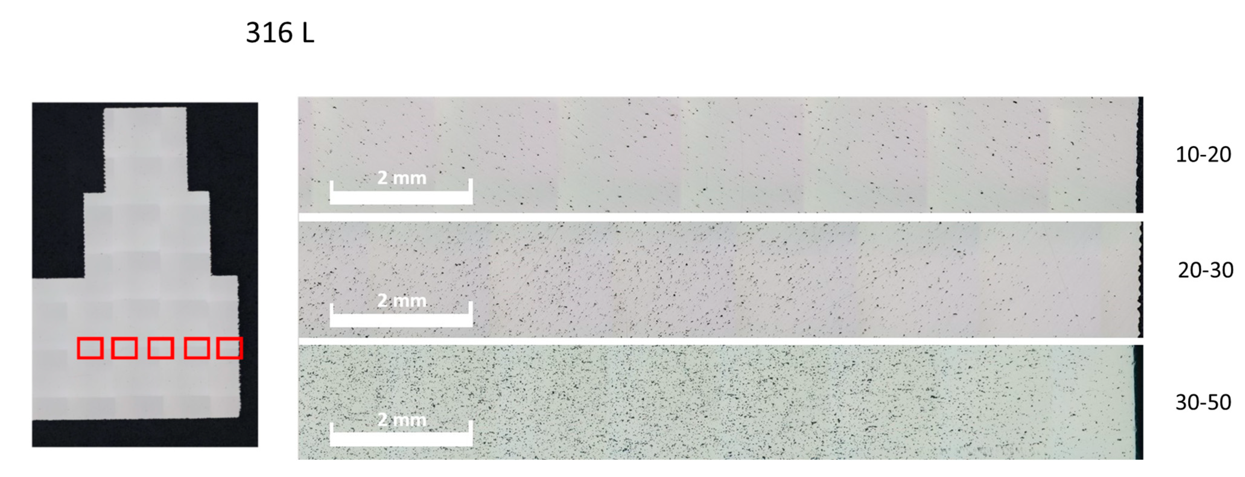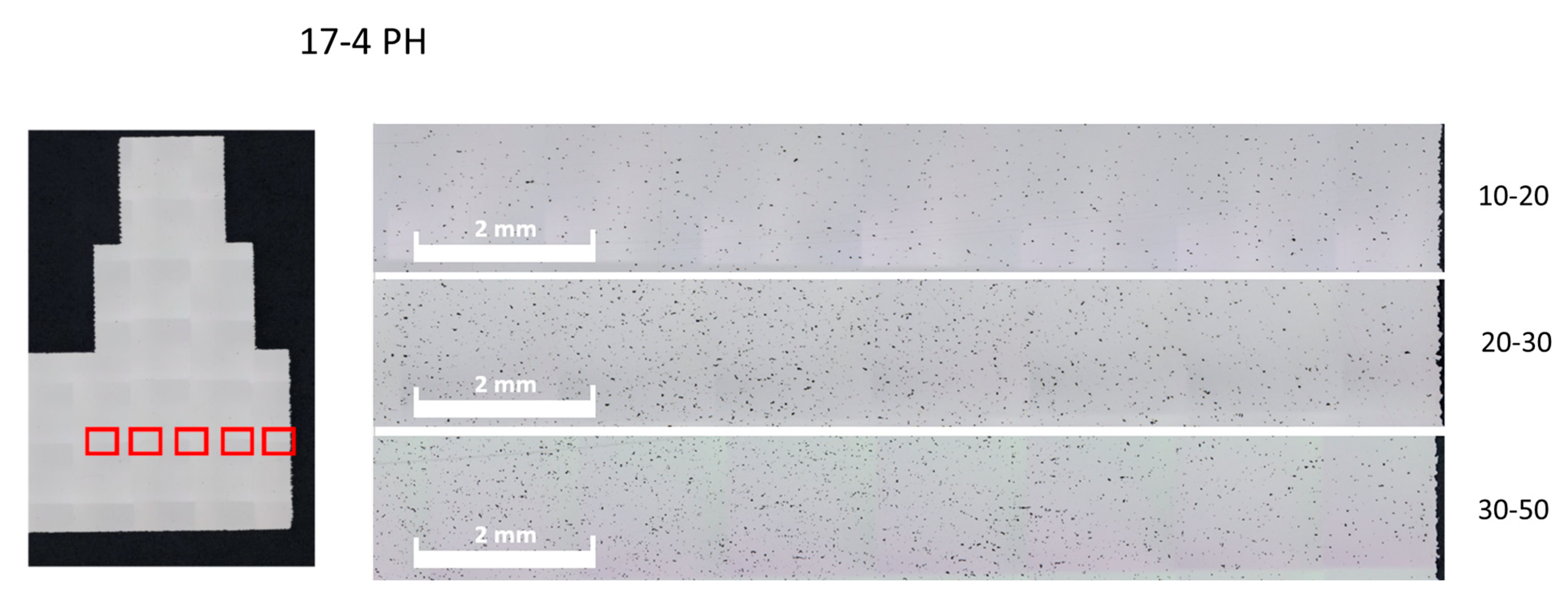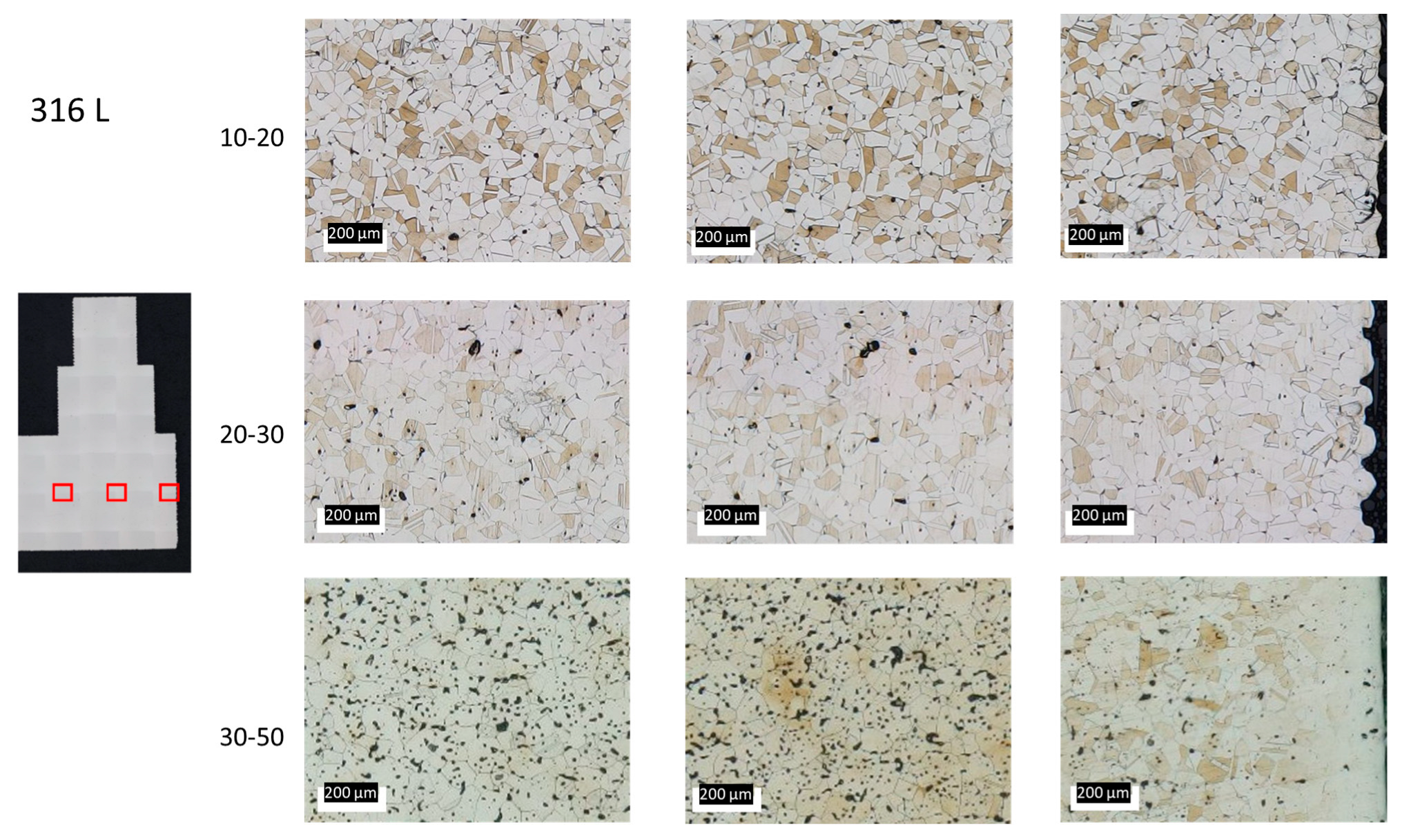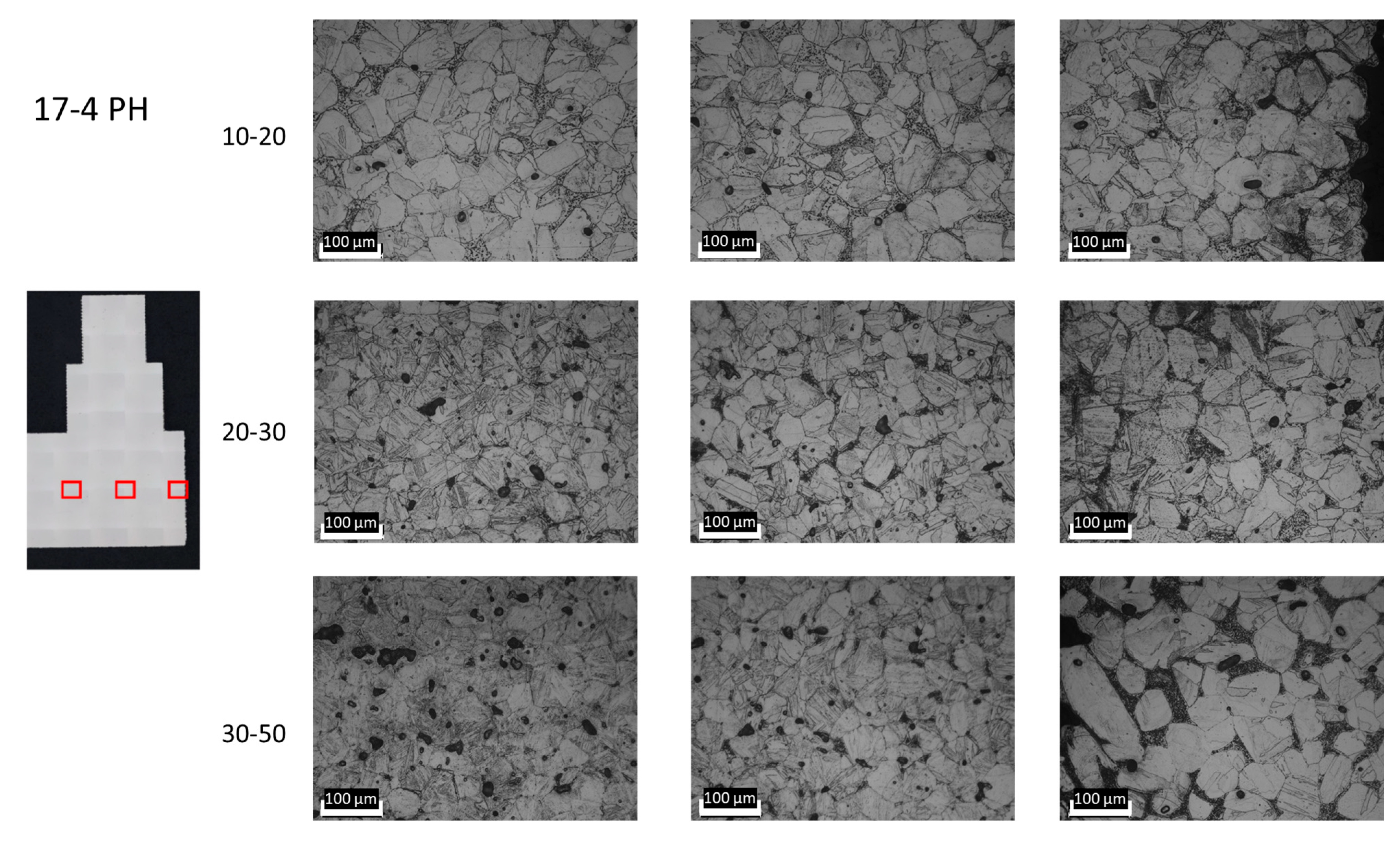 - A homogeneous sintered density was observed in the 17-4 PH samples, while it was influenced by the size in 316L (higher density in small samples). This is attributed to the different sintering mechanisms (solid state sintering in 316L, liquid phase sintering in 17-4 PH).