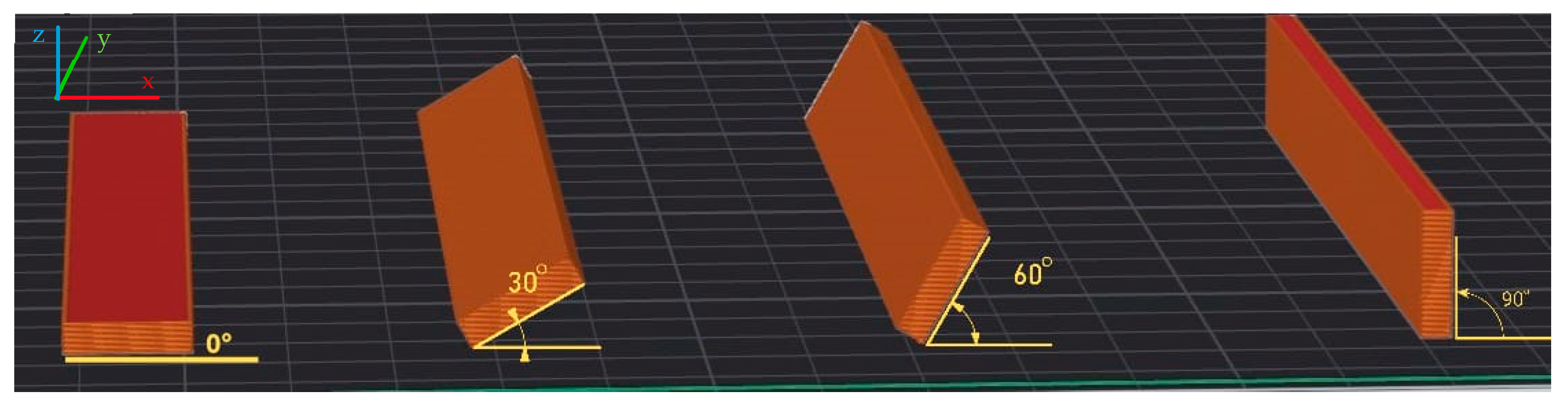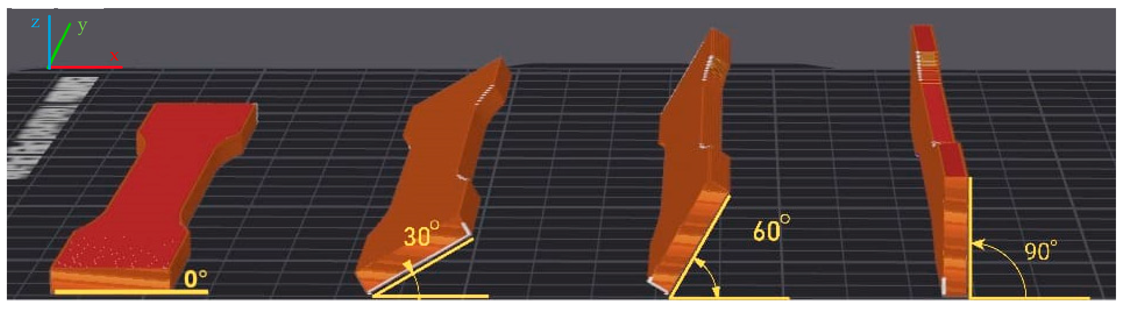 - Guessasma, S.; Belhabib, S. Effect of the Printing Angle on the Microstructure and Tensile Performance of Iron-Reinforced Polylactic Acid Composite Manufactured Using Fused Filament Fabrication. J. Manuf. Mater. Process. 2024, 8, 65. [Google Scholar] [CrossRef]