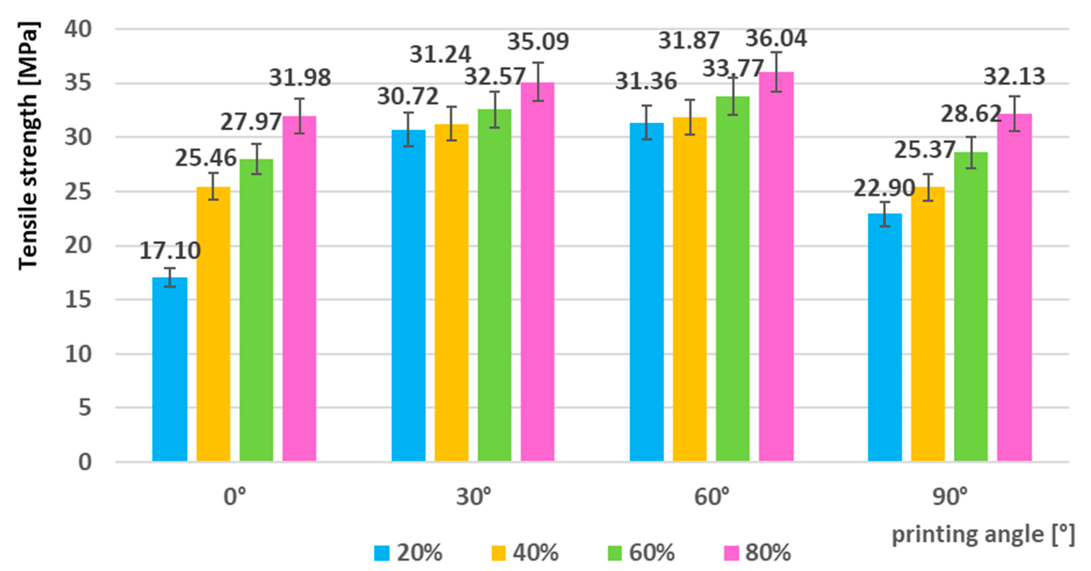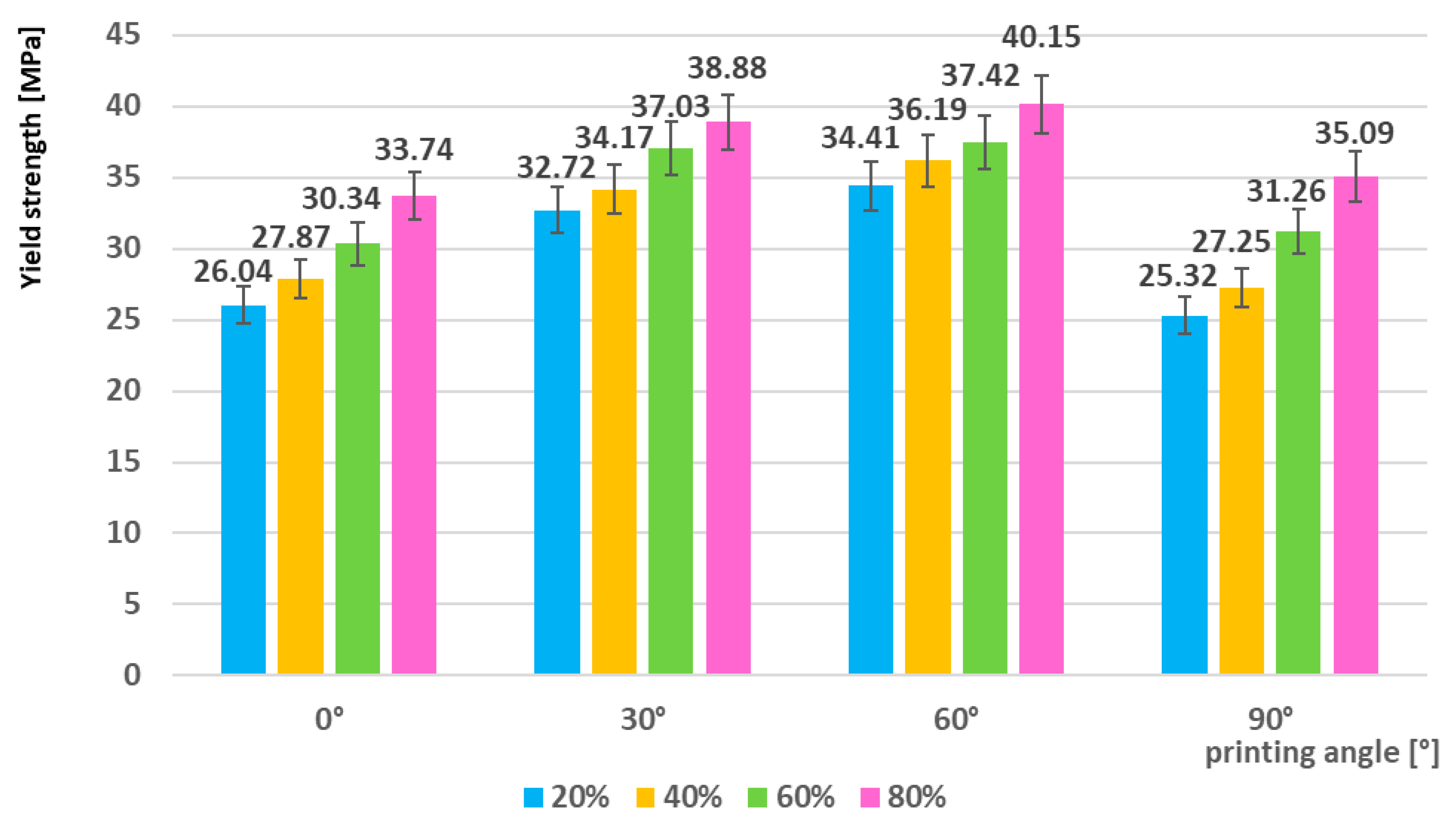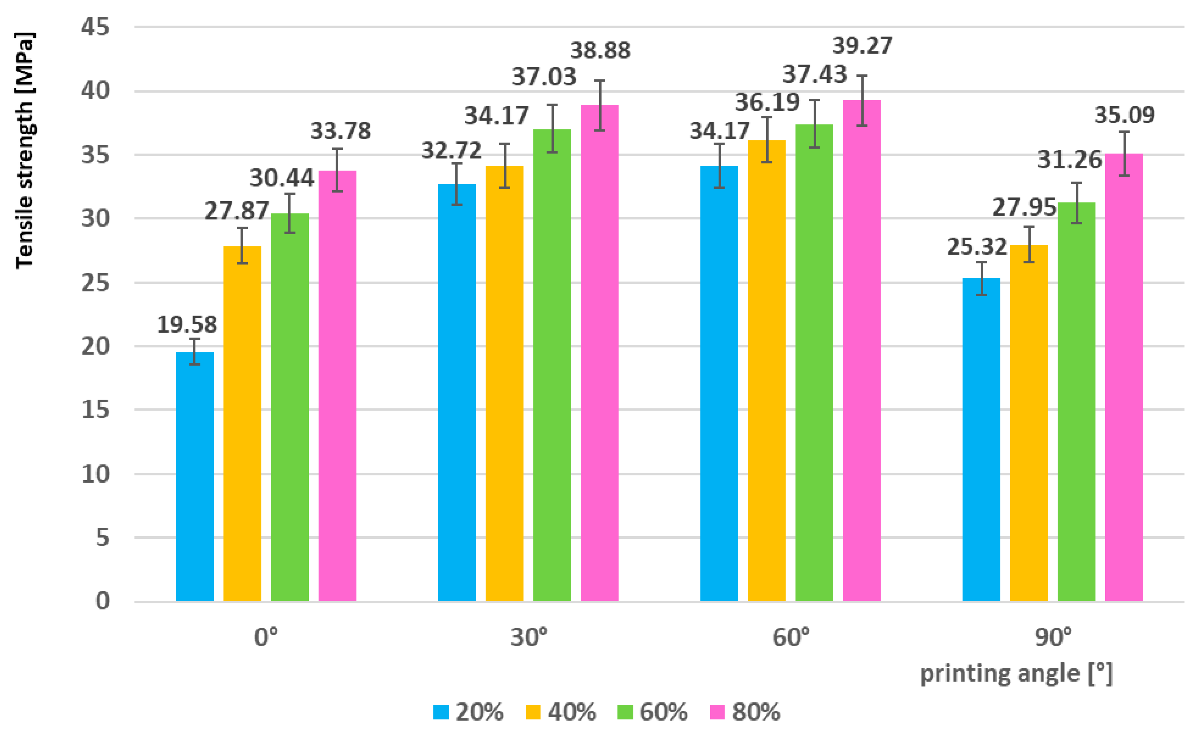 - Tensile tests of the as-printed specimens demonstrated a clear dependence of mechanical performance on the filling density and printing orientation. The mechanical properties systematically increased with higher infill density, confirming the positive correlation between material compactness and load-bearing capacity. The lowest tensile strength was observed for the 0°/20% configuration (19.58 MPa), whereas the highest values were achieved at 60°/80% (tensile strength 39.27 MPa, yield strength 40.15 MPa, and elastic modulus 1540.45 MPa). This represents an improvement of approximately 100% in tensile strength and about 54% in both yield strength and modulus compared to the weakest configuration. A subsequent decline at 90° indicates that excessive fiber misalignment can reduce the overall mechanical integrity of printed parts.