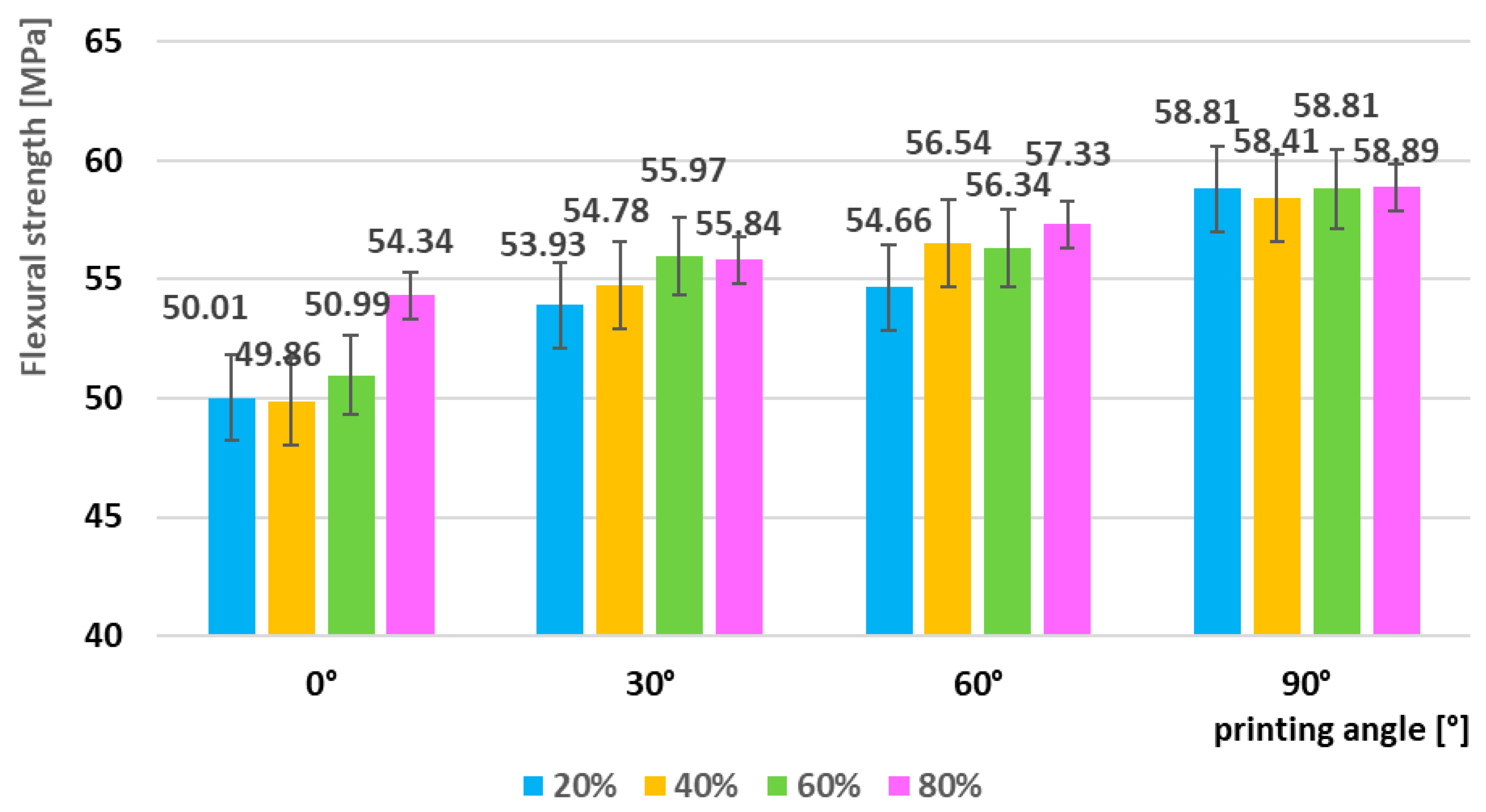 - Flexural testing of the as-printed series confirmed a similar pattern. The lowest flexural strength was obtained for the 0°/20% configuration (50.01 MPa), while the highest value was recorded at 90°/80% (58.89 MPa), representing an increase of approximately 18%. The flexural modulus ranged from 2374 MPa to 2739 MPa, showing only about a 15% difference between the minimum and maximum, which suggests that the stiffness of the material is less sensitive to print orientation than its strength.