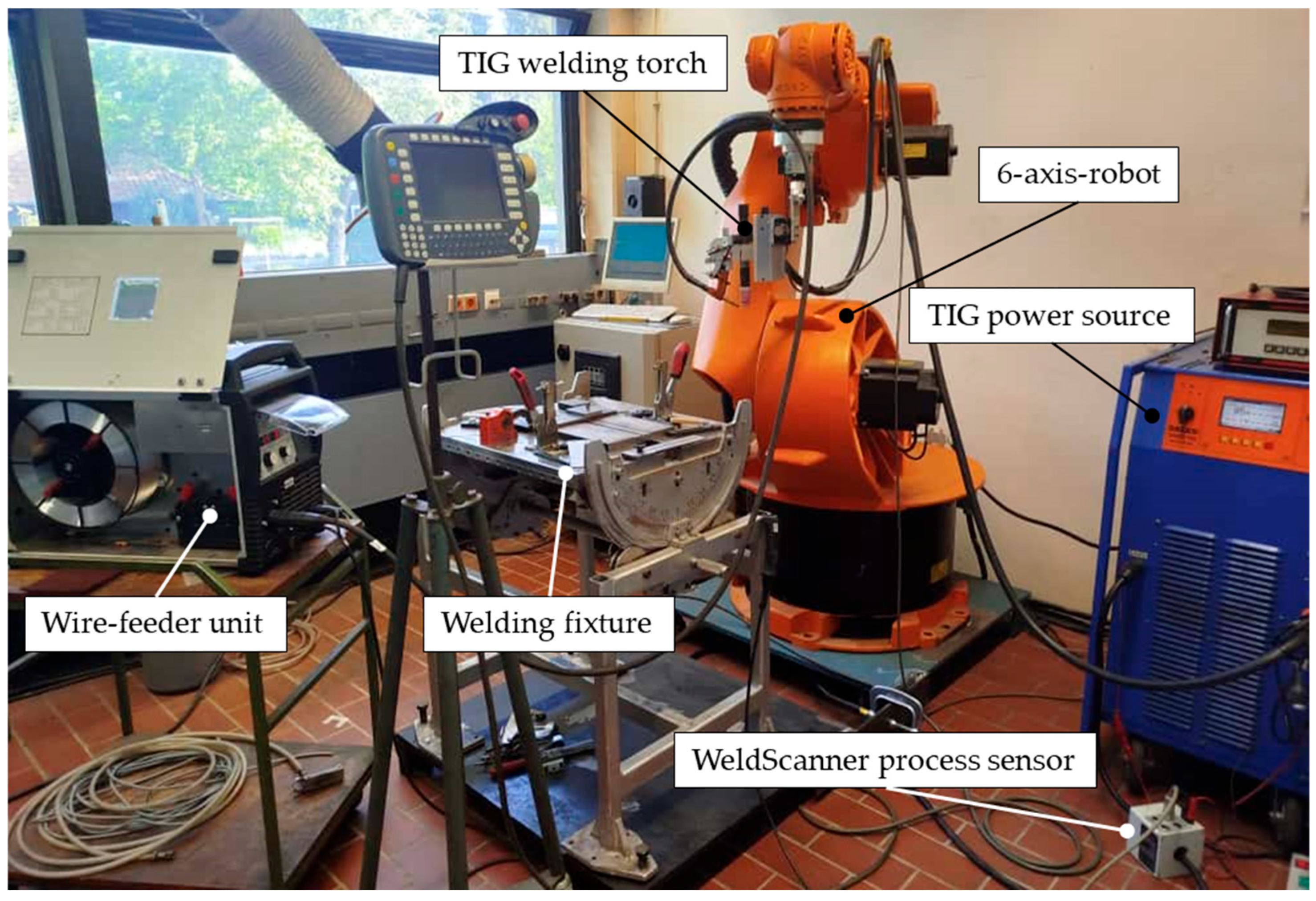 Table 3 are the average values determined from the data of the HKS WeldScanner (HKS Prozesstechnik GmbH, Halle, Germany), which was used to record the welds. The line energy was then calculated from the average values determined and the specified welding speed. Welding was carried out with the TIG power source DALEX VARIO TIG 400 W—AC/DC (DALEX Automation & Welding GmbH, Wissen, Germany), with an alternating current (80 Hz; balance: 50–50%) and a 6-axis robot (KUKA Aktiengesellschaft, Augsburg, Germany). The experimental setup is shown in