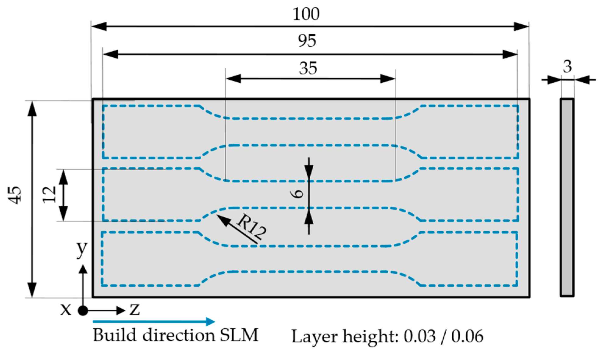 28]. As a reference, tensile tests were carried out on the base material, too. For this purpose, three flat tensile specimens were taken from three additively manufactured plates each. Two plates with a layer height of 0.06 mm and one plate with a layer height of 0.03 mm were tested, respectively. The tensile specimen geometry for the base material was designed based on the tensile test specimen of form E according to DIN 50125 [