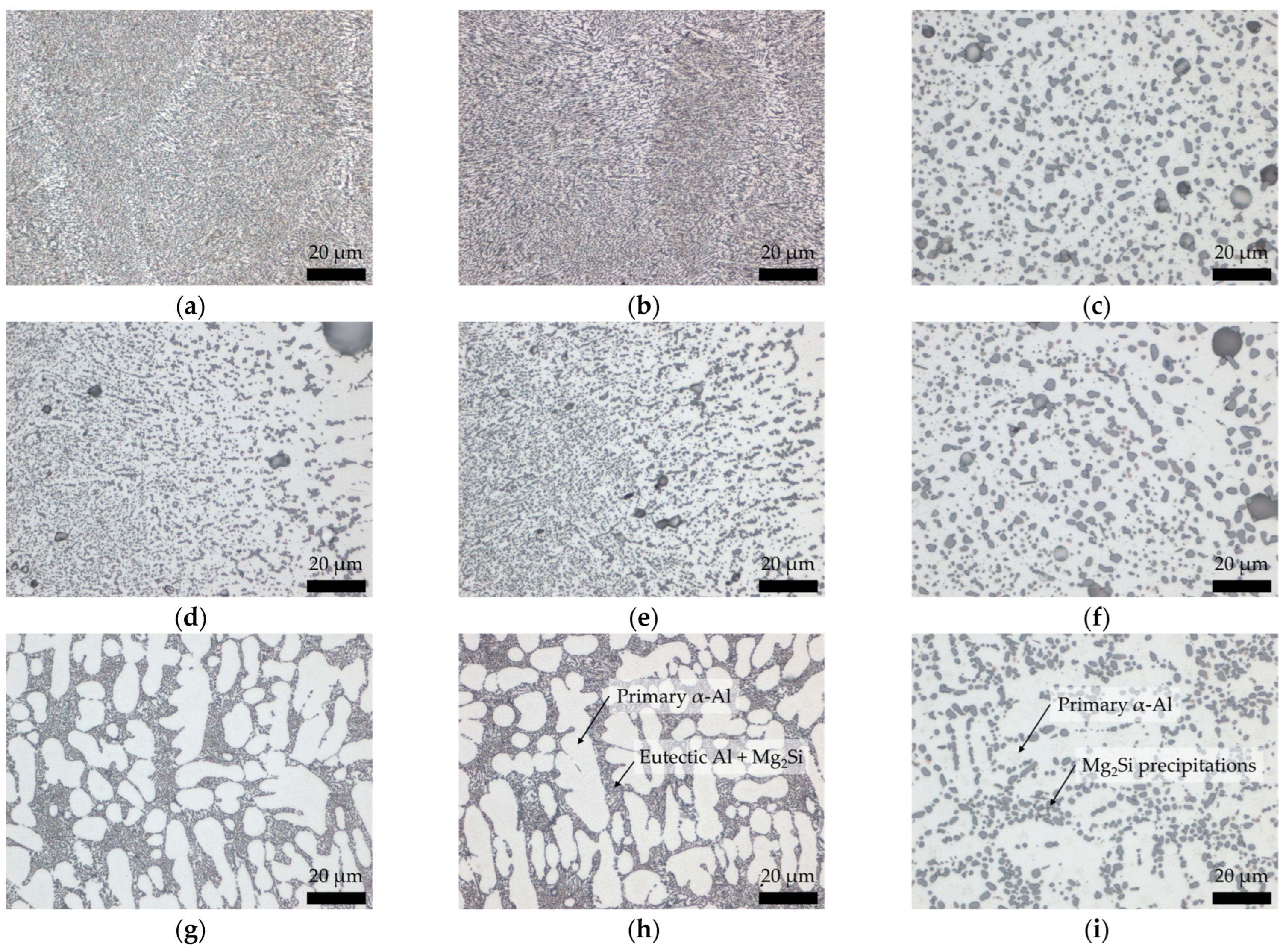 2Si precipitations in an α-Al matrix. The heat treatment resulted in an overall more uniform and refined microstructure, both within the weld seam and in the adjacent base material, as previously observed by Alghamdi et al. [