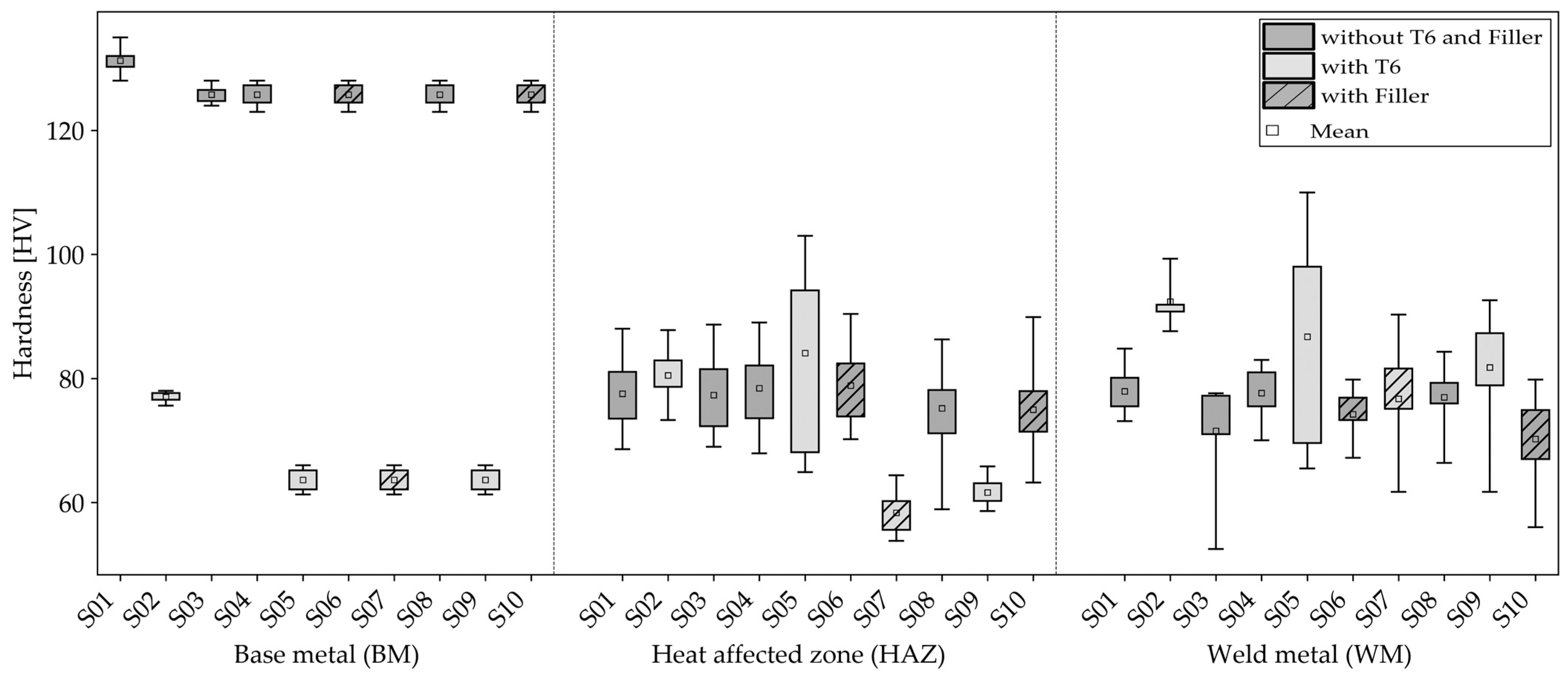Figure 9 shows the measured microhardness distribution of the 10 sample types. In the absence of a subsequent T6 heat treatment, the weld seam showed a lower hardness (70–80 HV) in comparison with the adjacent base material (BM) (125–130 HV). The application of T6 heat treatment resulted in a decrease in hardness in the base material to 60–75 HV. In contrast, the hardness in the weld metal (WM) slightly rose to 70–80 HV.