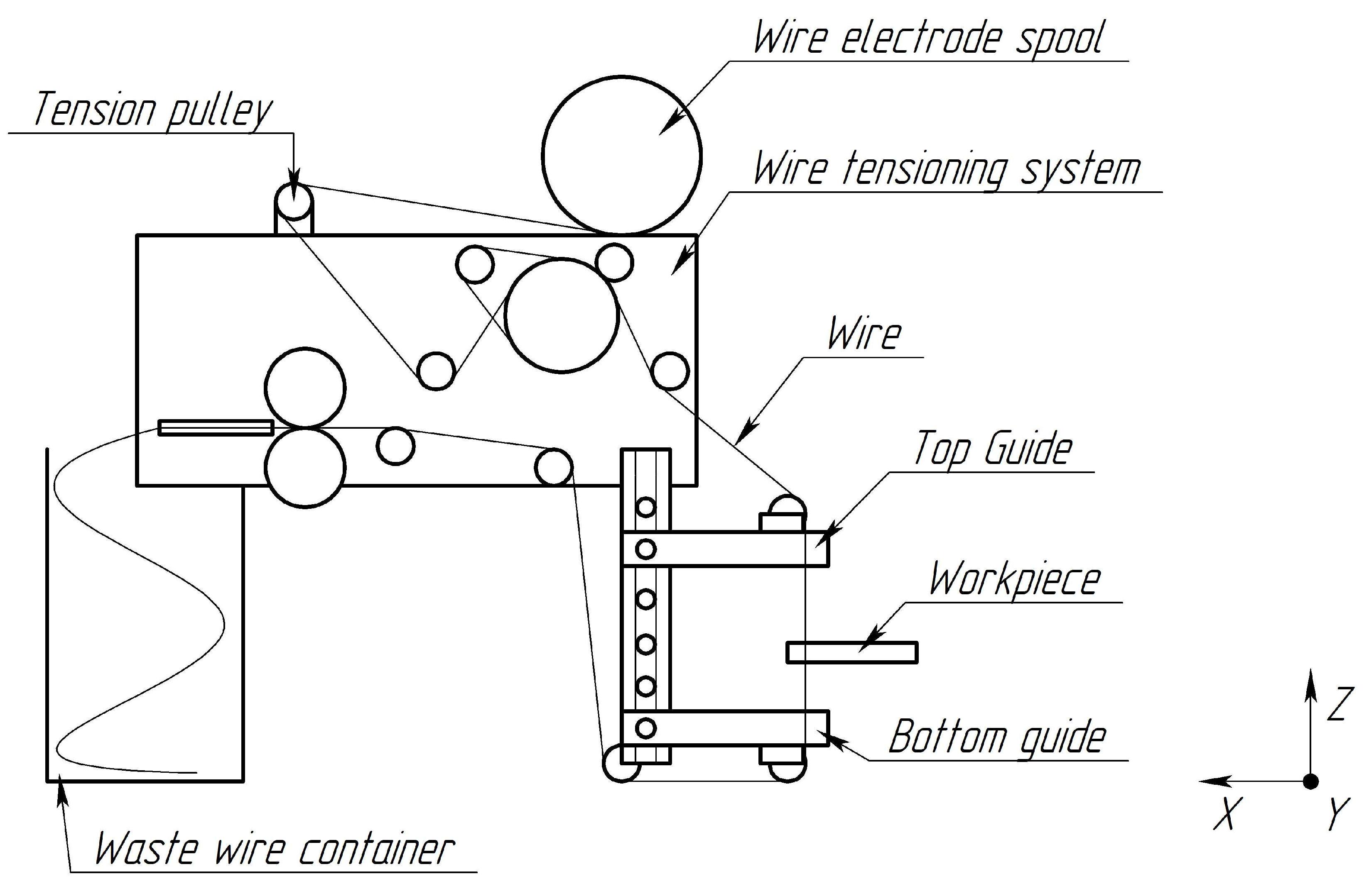 3]. The removed material, or debris, is permanently flushed from the working zone by dielectric fluid. Wire Electrical Discharge Machining (WEDM) uses a thin wire as a tool electrode to remove material from an electrically conductive workpiece through a series of electrical discharges. The diameter of the wire electrode typically ranges from 0.05 mm to 0.33 mm, with sizes of 0.1–0.3 mm being commonly used [