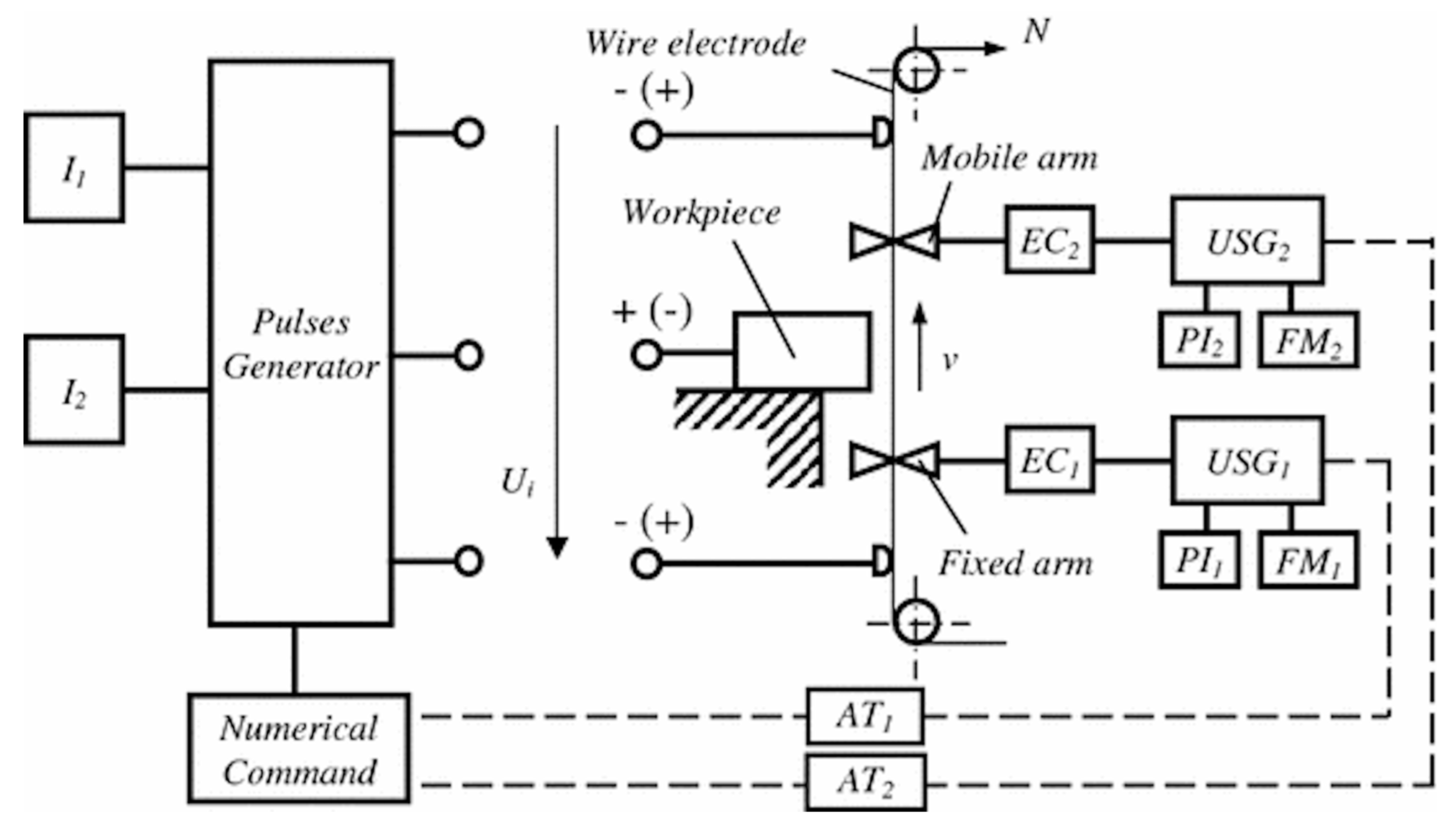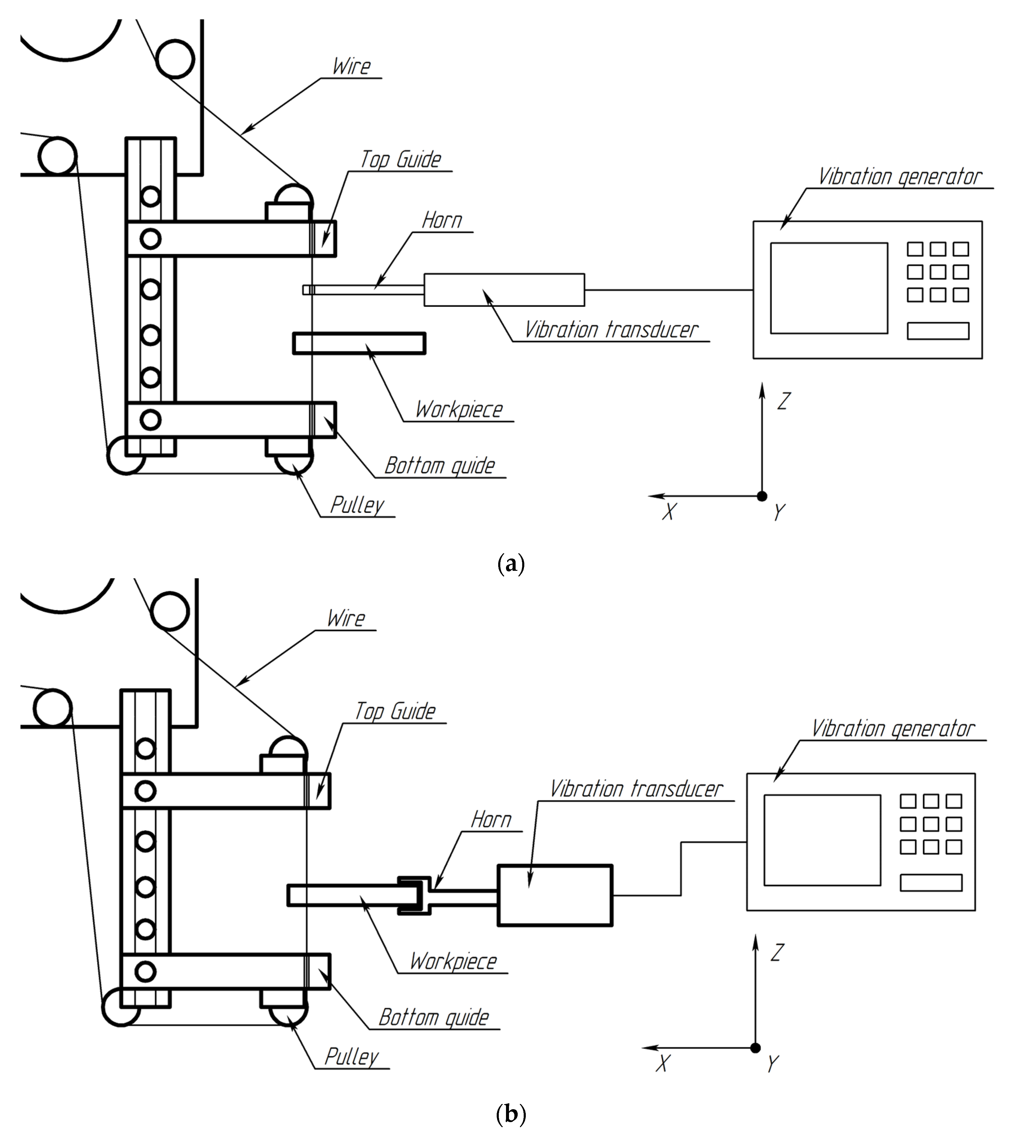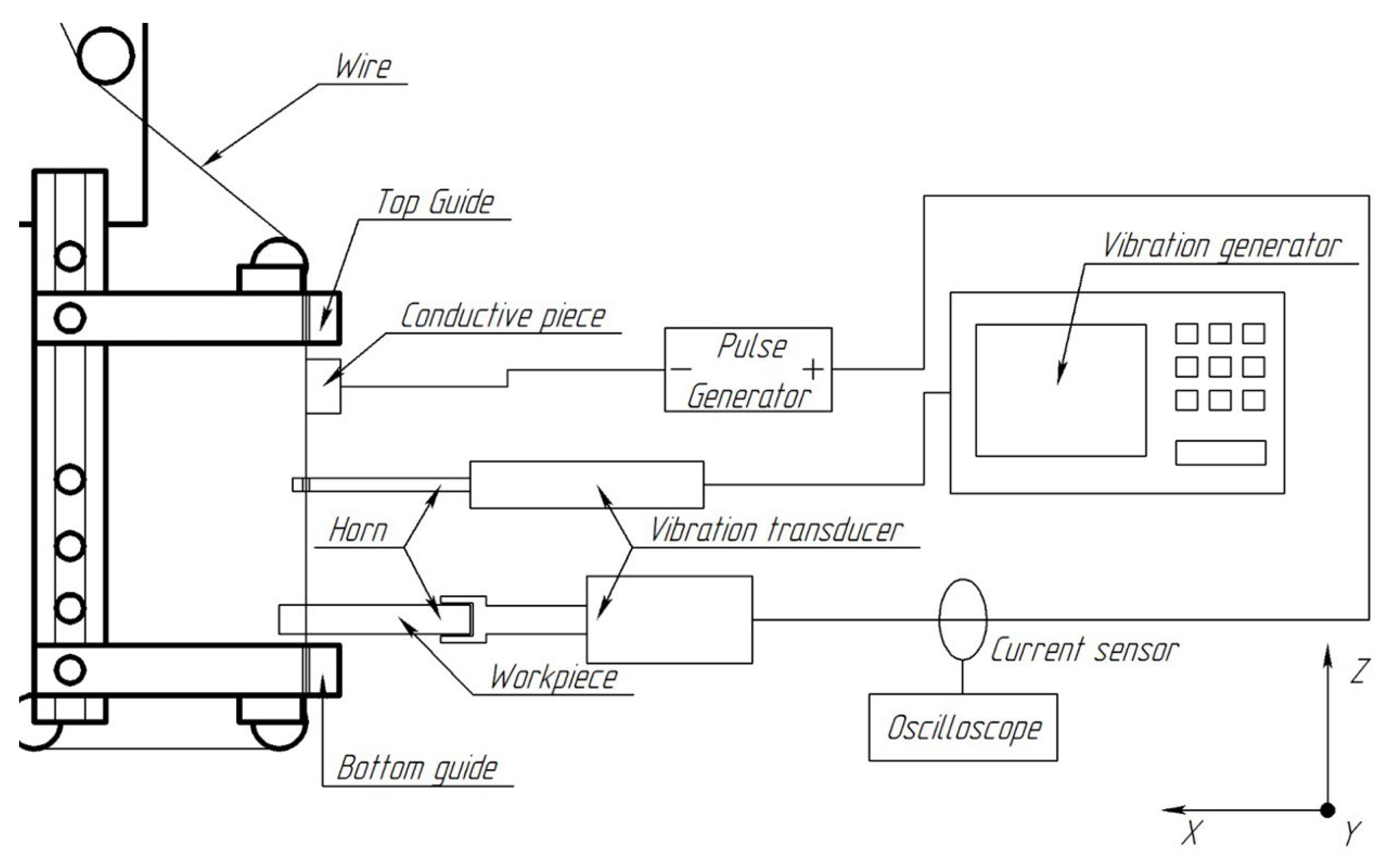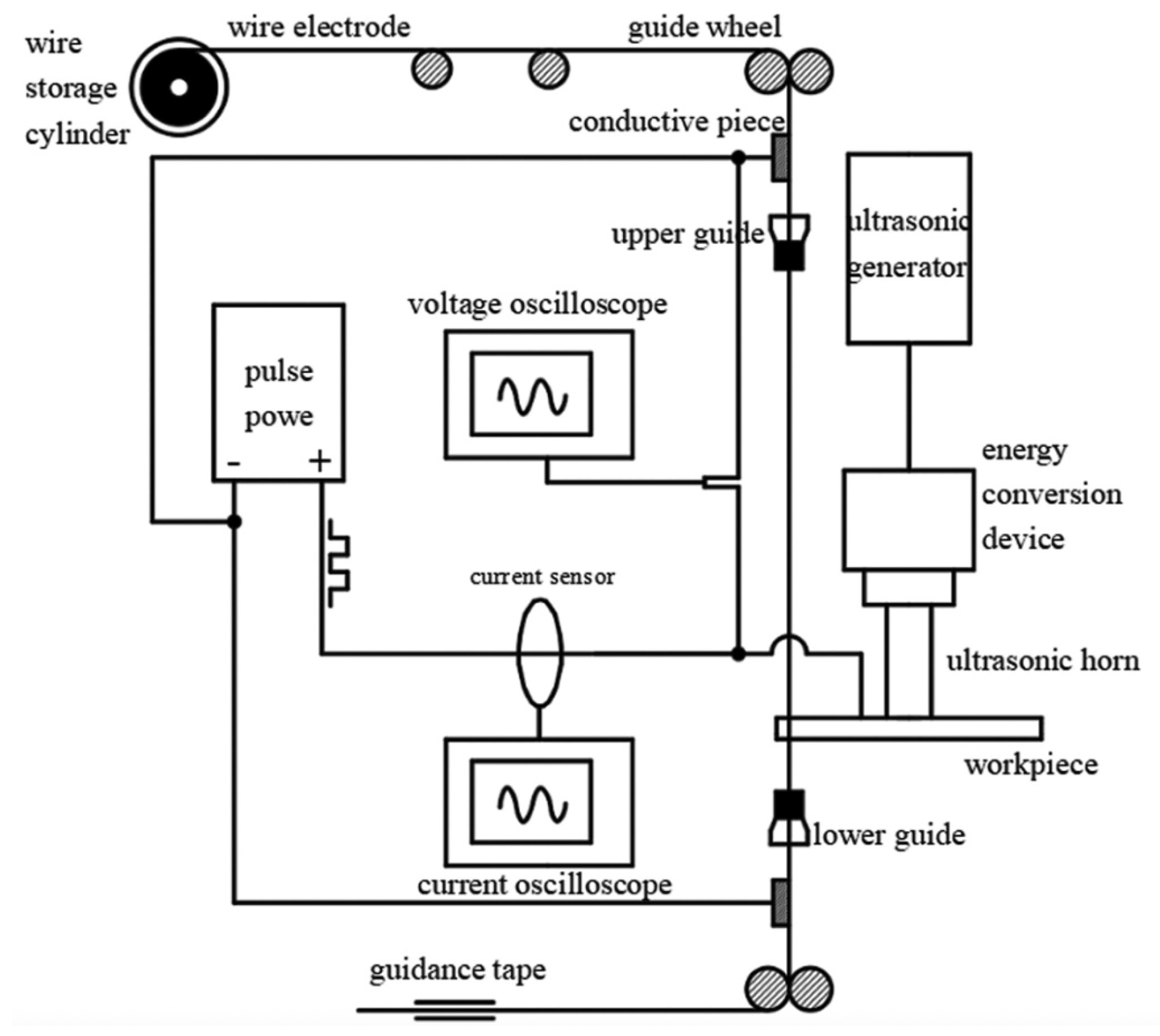 53] examined WEDM using two ultrasonic transducers connected to the working wire above and below the workpiece, generating perpendicular vibrations both along and across the wire feed direction. Experiments were conducted on heat-treated 34 MoCrNi15 steel workpieces (54–56 HRC, 40 mm thickness) and X210CrW12 steel workpieces (60–62 HRC, 10–120 mm thickness). The author systematically investigated the effects of applying ultrasonic vibrations first separately to each end of the electrode, and then simultaneously to both transducers. The experimental setup is shown schematically in