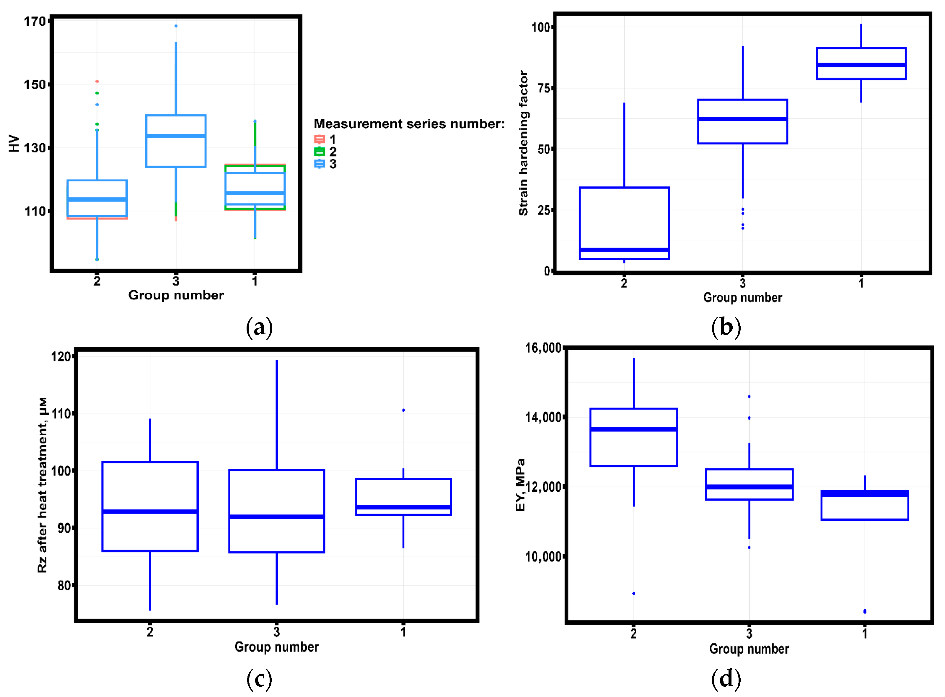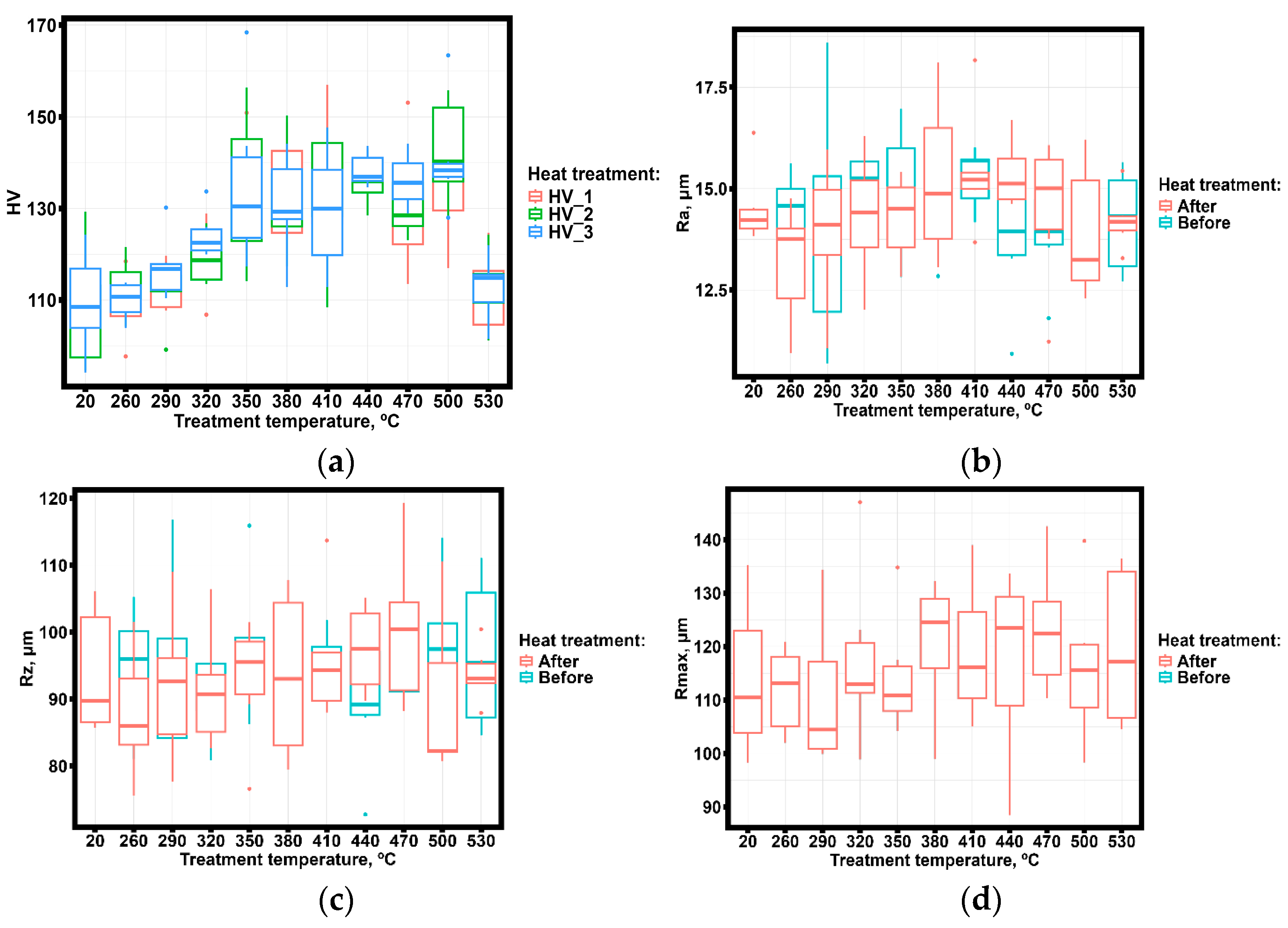 - Grigoriev, S.N.; Nikitin, N.; Yanushevich, O.; Kriheli, N.; Kramar, O.; Khmyrov, R.; Idarmachev, I.; Peretyagin, P. Experimental and Statistical Analysis of the Effect of Heat Treatment on Surface Roughness and Mechanical Properties of Thin-Walled Samples Obtained by Selective Laser Melting from the Material AlSi10Mg. Materials 2023, 16, 7326. [Google Scholar] [CrossRef]
