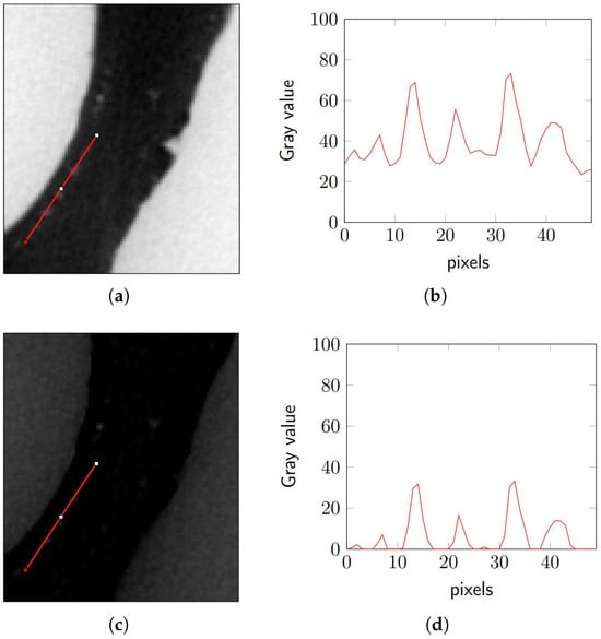 Morphological reconstruction in grayscale showing image 179/1014 in stack G2: (a) Study sample with the red line indicating the profile path used for gray-value extraction. (b) Corresponding profile graph of (a). (c) Study sample after morphological reconstruction (H = 67) with the red line showing the same measurement path. (d) Profile graph of (c).