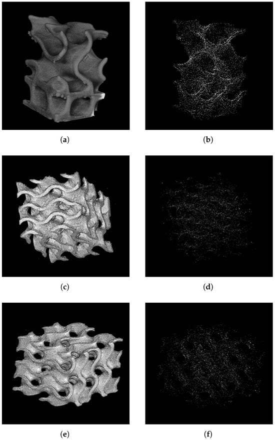 3D Reconstruction: (a) Hybrid gyroid-diamond. (b) Hybrid gyroid-diamond porosity. (c) Gyroid 1. (d) Gyroid 1 porosity. (e) Gyroid 2. (f) Gyroid 2 porosity.