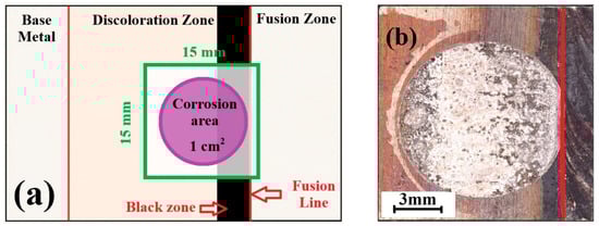 The pitting corrosion behavior within the HAZ was evaluated through cyclic polarization and EIS, following the ASTM G5-13 [] standard. Test specimens were prepared with dimensions of 15 × 15 mm, providing an exposed surface area of 1 cm2 in contact with the electrolyte solution (Figure 3). The test electrolyte consisted of an aqueous mixture containing 0.5 M sodium chloride (NaCl) and 0.5 M sulfuric acid (H2SO4) to simulate a highly corrosive environment. All experiments were carried out at a controlled temperature of 23 ± 2 °C, in compliance with ASTM guidelines, and each test was repeated three times to ensure reproducibility.