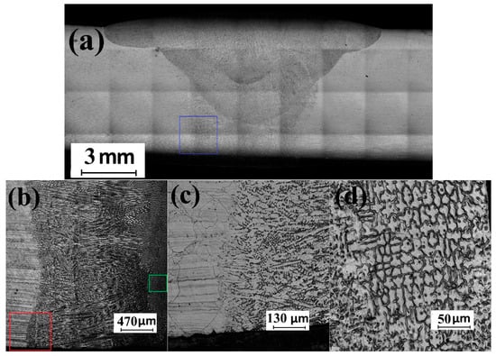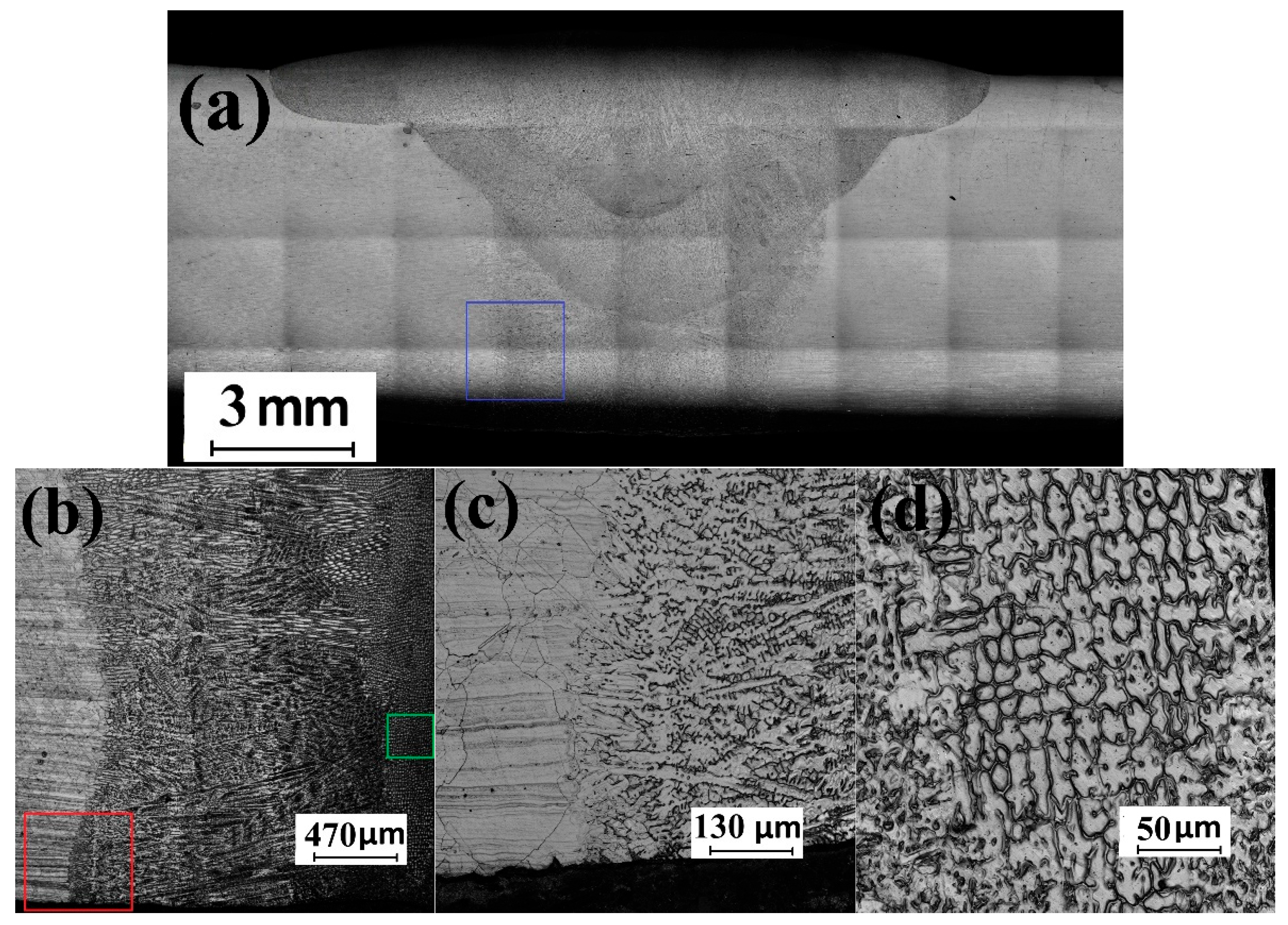 Weld microstructure: (a) cross-section; (b) weld line (blue box in (a)); (c) adjacent HAZ/base metal (red box in (b)); (d) weld-metal (green box in (b)).