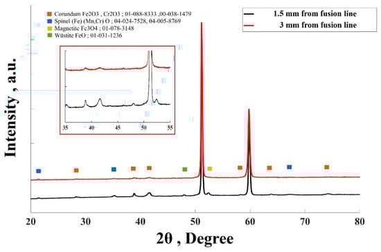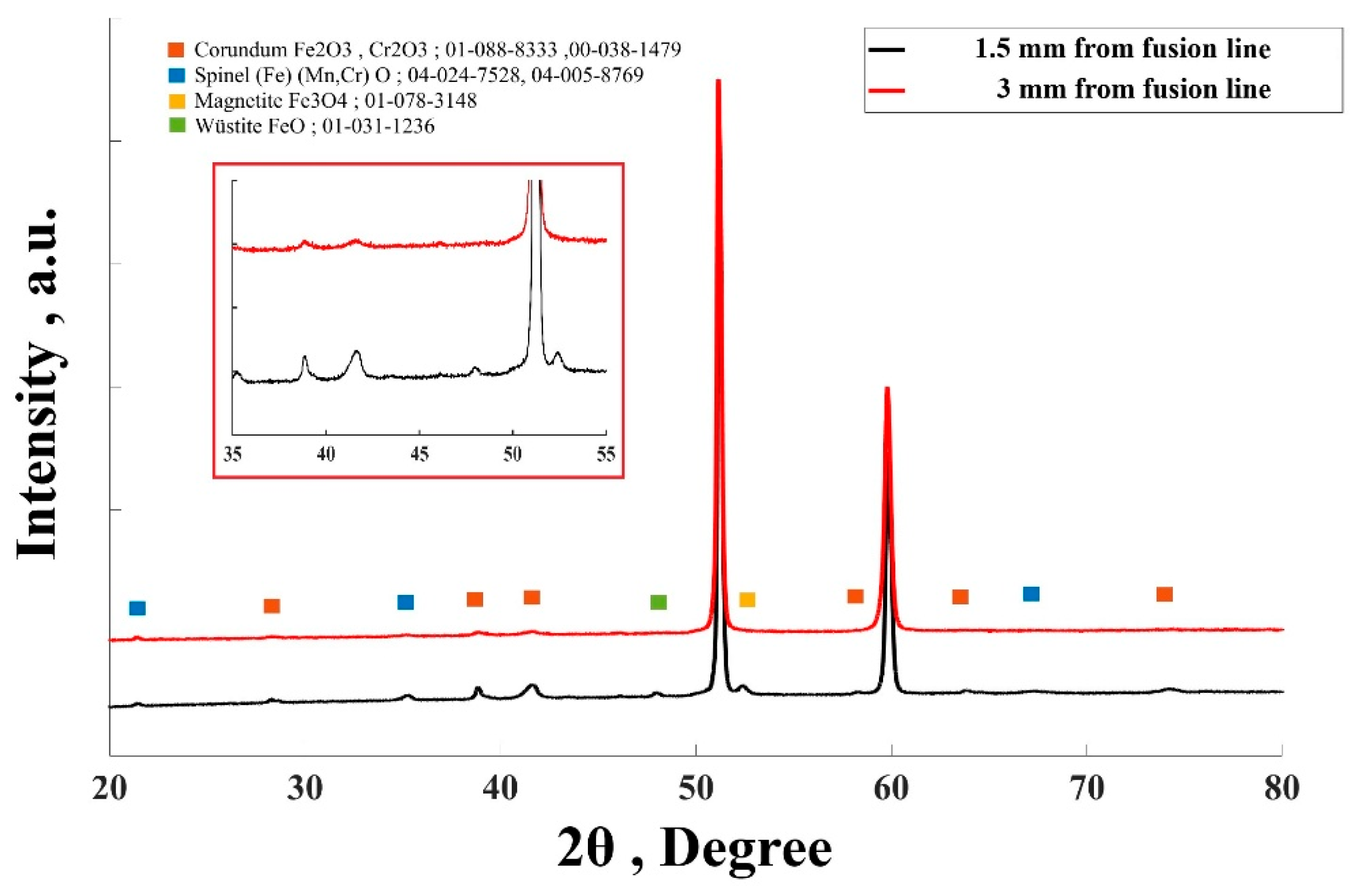 When wüstite is porous, however, oxygen diffusion is restricted, preventing complete conversion to magnetite or hematite. A thin magnetite layer then forms on the surface, while wüstite persists beneath it—a phenomenon previously observed on corroded steel surfaces []. The limited oxygen transport through porous wüstite thus slows oxidation and leaves residual FeO even at ambient conditions. Notably, FeO and Fe2O3 peaks are visible at 1.5 mm from the fusion line, with FeO identified near 48°, but these peaks disappear at 3 mm, as shown in Figure 8.