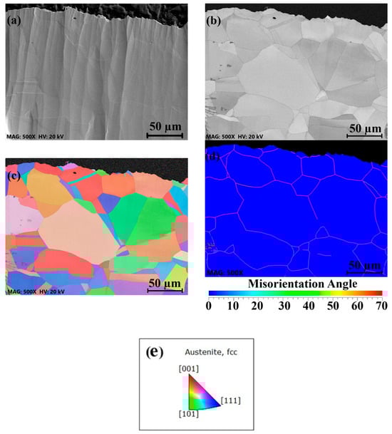 In AISI 316L stainless steel, the weld pool solidifies in the ferrite–austenite mode, producing a predominantly austenitic weld metal. As shown in Figure 5d, the fusion zone exhibits dendritic austenite, while Figure 5b provides a closer view of the weld line and fusion boundary (highlighted by the blue box in panel a). Figure 5c (red box in b) depicts the adjacent heat-affected zone (HAZ) and base metal region, where thermal exposure caused recrystallization and grain coarsening without melting or dendrite formation [,]. Our work evaluates only the inner surface of the HAZ (discoloration layer); the fusion-zone image is included solely to orient the reader and mark boundaries, and subsurface features inside the material do not affect our results and are not investigated in this paper.