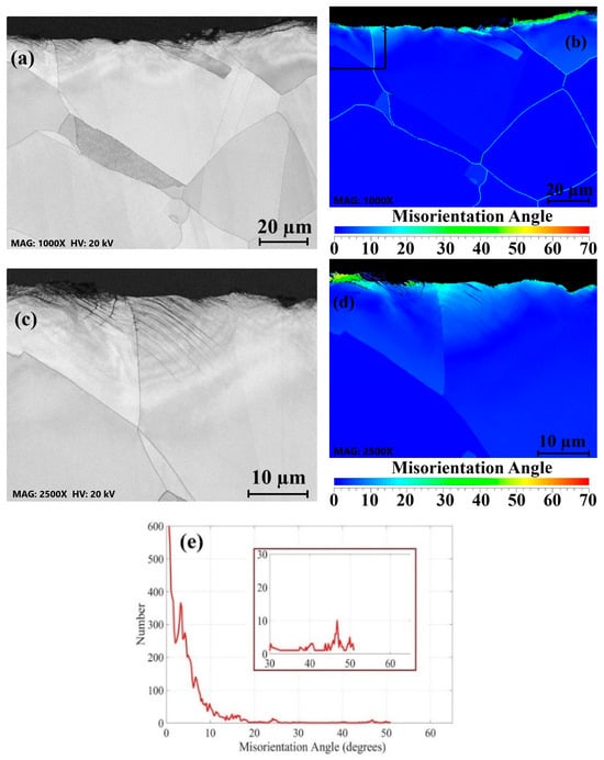 EBSD of 316L (B2): (a) band-contrast map; (b) orientation map; (c) higher-magnification view of the black zone in (b); (d) orientation map for (c); (e) average misorientation vs. depth for B2.